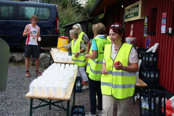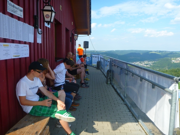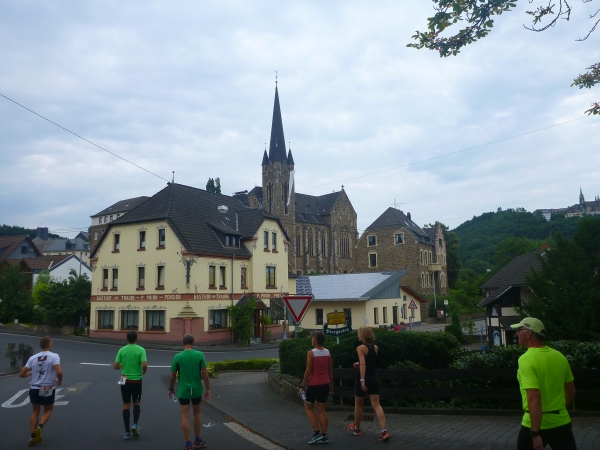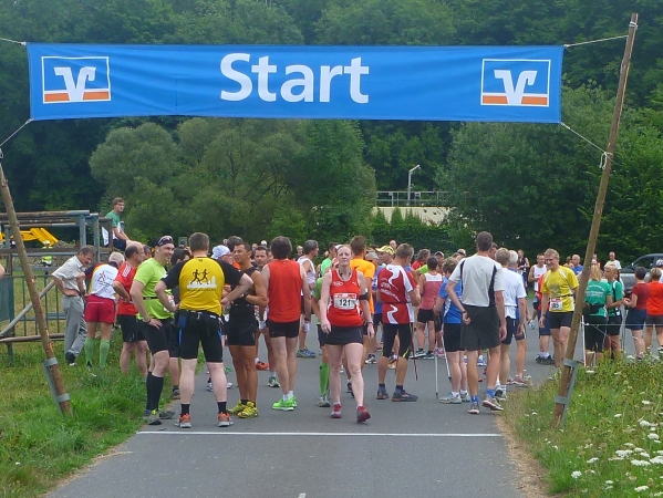 Zusammen mit Markus lasse ich die Shuttlebusse fahren und mache mich auf den Fußweg abwärts zum Start nach Hausen. Eine gute Gelegenheit, um einen Teil der Strecke kennen zu lernen. Und es ersetzt das Warmlaufens. Im Luftkurort Hausen angekommen, haben wir noch etwas Zeit. Schließlich laufen wir doch einen Kilometer ein.