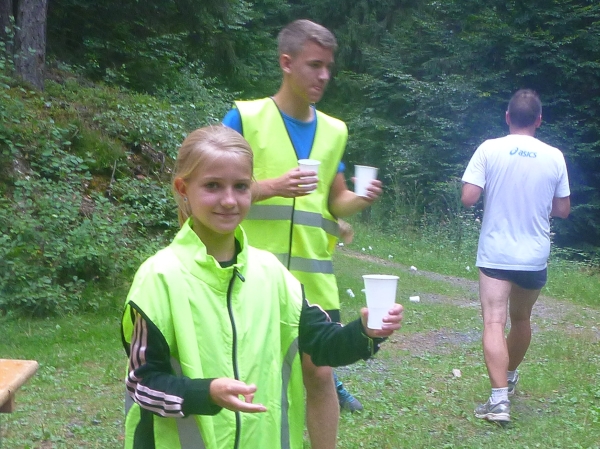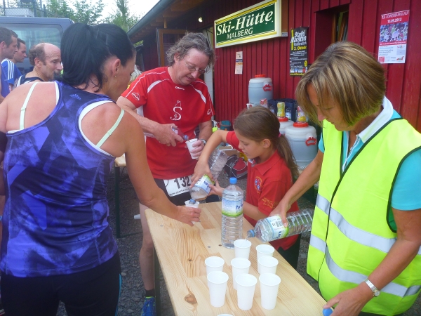 Auf dem Boden sehe ich die Angabe, dass 4,4 Km hinter uns liegen. Kurz darauf kommen wir sogar an einer Verpflegungsstelle vorbei. Man, das ist ein Service hier. Und wieder grüßt eine Kuhglocke die Läufer.