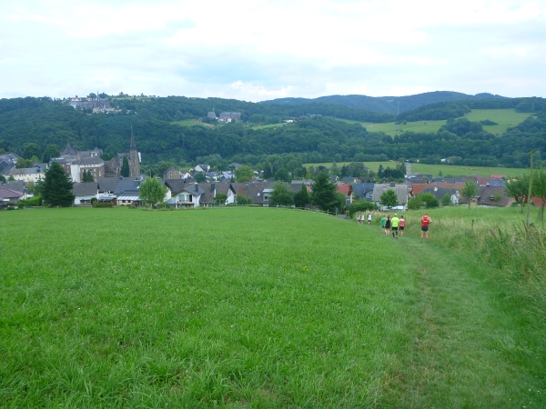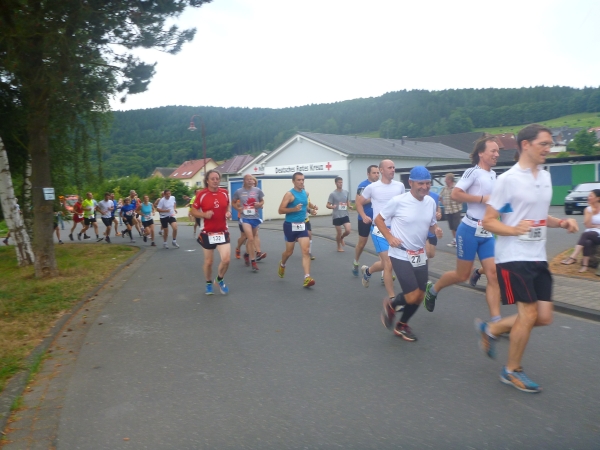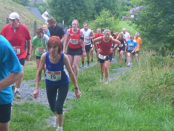 Die ersten 400m werden auf flacher Asphaltstrecke absolviert. Aber dann ist erst einmal Schluss mit lustig. Schließlich ist das heute ein Berglauf und 370 Hm warten auf uns. Noch in Hausen führt die Straße steil nach oben. Wir verlassen den Asphalt und laufen auf Naturwegen aus dem Ort heraus.