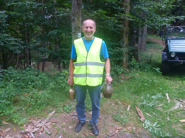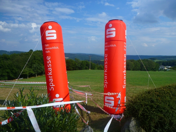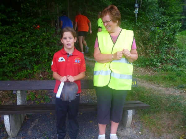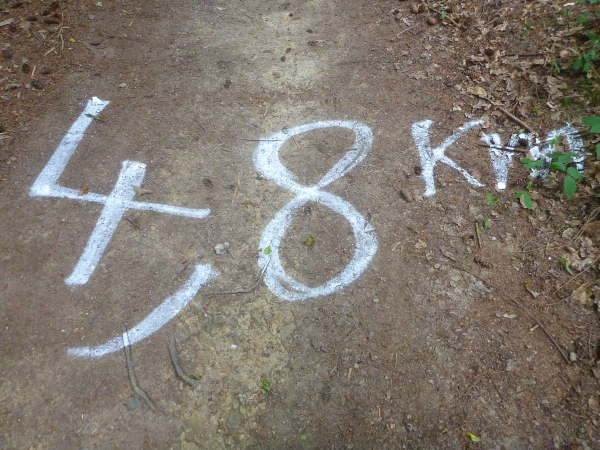 Über Gras als Laufuntergrund kommen wir rasch zum Wald. Vor dem Wald werden wir von einem Mädel mit einer Kuhglocke angefeuert. An der Markierung auf dem Boden ist zu erkennen, dass wir bereits 1,2 Km hinter uns haben. Der Wald bietet Schatten, den wir aber wegen der aufgezogenen Wolken nicht brauchen. Schade, die Sonne bei der Startnummernausgabe oben auf dem Malberg war mir lieber. Aber es bleibt trocken.