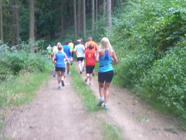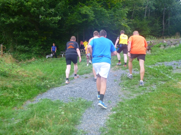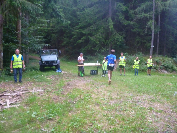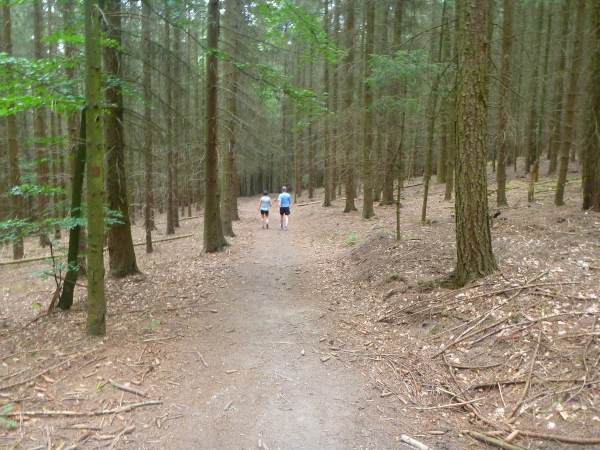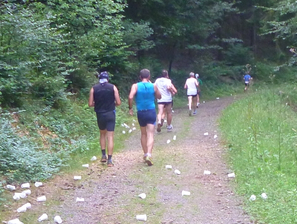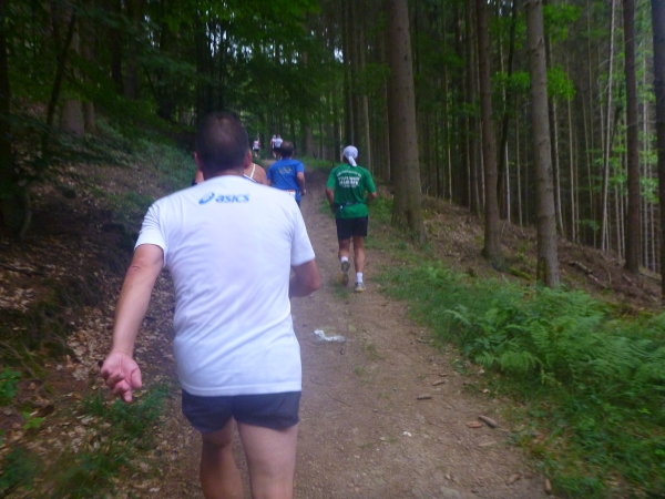 Nach den ersten 800m mit knackigem Anstieg werden wir mit 1,7 Km abwärts laufen belohnt. Auf gutem Waldweg lässt es sich herrlich laufen. Ich habe das Gefühl zu fliegen. Na ja, sagen wir mal, ich bin schneller als beim Rauflaufen. Ich mag es kaum glauben, aber schon bin ich bei Km 2,9 und habe damit fast die Hälfte geschafft.