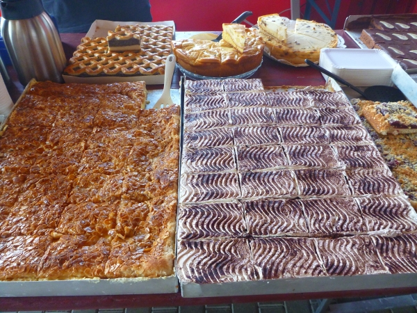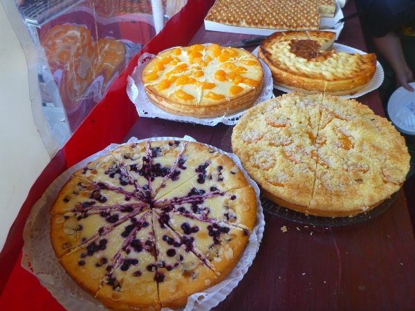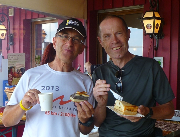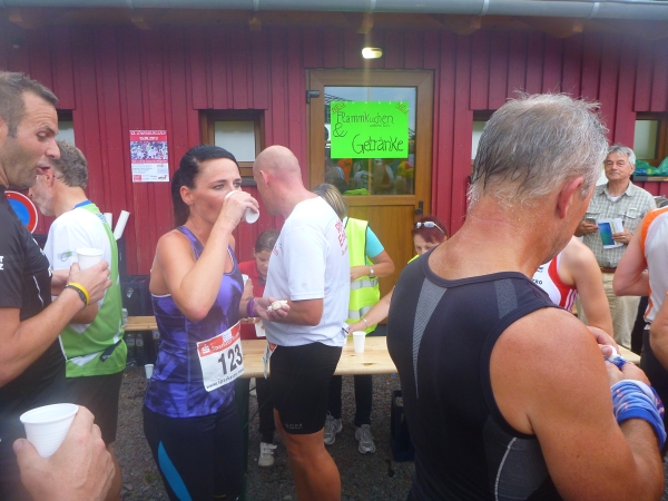 Aber erst einmal durch den roten Zieleinlauf und dann rann an die Getränke. Es gibt Tee, Iso, Wasser. Nach erstem Flüssigkeitsausgleich gehe ich rasch zum Kuchen. Koteletts und Würstchen lasse ich unbeachtet, obwohl auch sie lecker duften. Mein Lieblingskuchen ist noch da. Käsekuchen mit Rosinen, lecker! Ich liebe diese Läufe in familiärer Athmosphäre mit diesen tollen Kuchenbuffets.