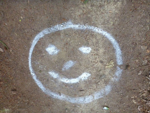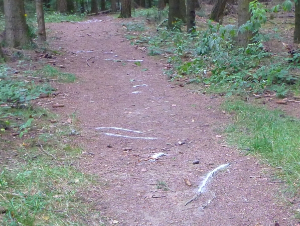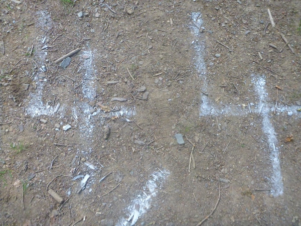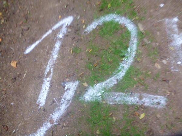 Mir fällt auf, dass auf dem Boden jede Wurzel und jeder Stein weiß markiert sind. Der Veranstalter hat sich richtig Mühe gemacht im Interesse der Sicherheit der Läufer. Wer trotz weißer Markierung noch fällt ist selber schuld.
