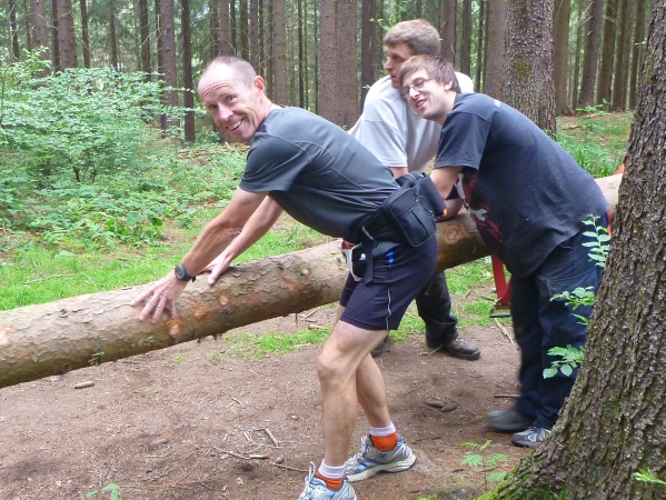 Ein unerwartetes Hinderniss tut sich auf. Ein riesiger Baumstamm liegt im Weg und muss entfernt werden. Ich packe mit an schon ist der Stamm weg. Oder hab ich da ein Foto vom Weg hinunter ins Tal falsch einsortiert? Der Weg ist jedenfalls frei und führt uns aufwärts der Skihütte entgegen.