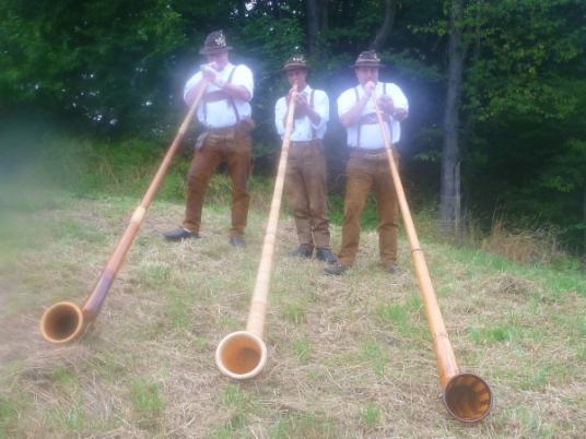 Das Ziel ist schon zu sehen. Dazu ist Wolfgang zu hören. Er feuert die Läufer auf dem Schlussstück an, macht ihnen sozusagen Beine. Da sind aber auch noch andere Töne zu vernehmen. Drei Alphornbläser entlocken ihren Instrumenten gar liebliche Laute. Das hat was und erinnert mich an den Jungfrau-Marathon in der Schweiz. Dank an die Herren!