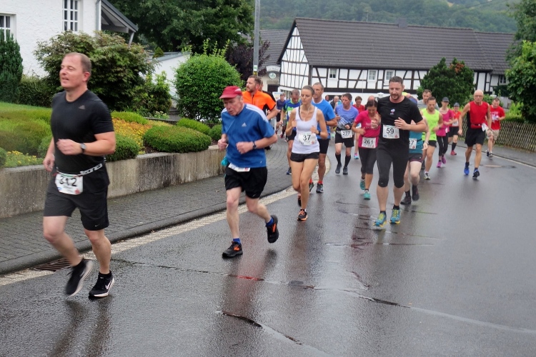 Es ist diesmal kein traditionell gutes Läuferwetter am Malberg. Kurz vor dem Start an der Wied in Hausen fängt es an zu regnen. Die Bürgermeisterin erklärt in ihrer kurzen Ansprache: Bei schönem Wetter kann jeder! Recht hat sie. Viele Läufer warten im Schutz von Bäumen und Sträuchern die letzten Minuten vor dem Start. Ich treffe Hang An aus China. Der Lauf ist ja wirklich international hochklassig besetzt.