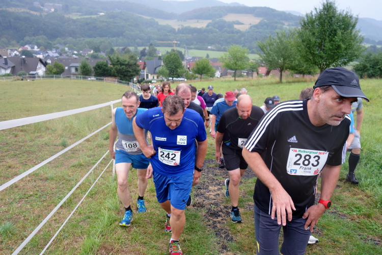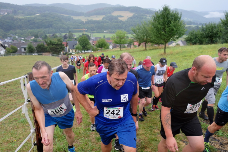 Schon beim Anstieg im Ort komme ich ins Schwitzen und Keuchen. Es geht mächtig nach oben. Ich falle wie alle um mich herum in den Gehschritt und kämpfe mich nach oben. Bald schon sind wir raus dem Ort und nach den letzten Häusern geht es über einen Feldweg durch Wiesen aufwärts zum Wald. Hier ist die Strecke identisch mit dem Wiedtal Ultra Trail (WUT).