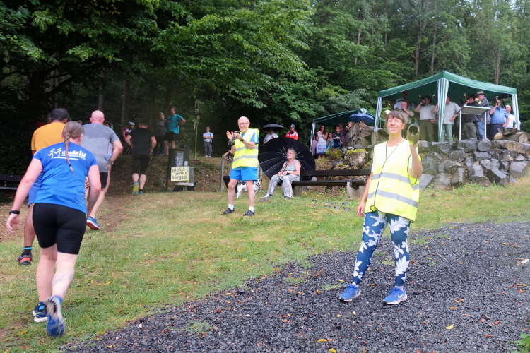 Am Waldrand stehen oberhalb des Hausener Wasserbehälters wieder die Jagdhornbläser der Bläsergruppe Rengsdorf/Waldbreitbach - eine schöne musikalische Unterstützung. Kommt wie jedes Jahr gut an. Diesmal stehen sie regenbedingt unter einem Pavillon. Ich freue mich besonders auf diesen Punkt, denn jetzt geht es zur Abwechslung links rum durch den Wald abwärts. Und das gut 1,5 Km. Da heißt es Fahrt aufnehmen. Der geschundenen Muskulatur tut die wechselnde Belastung nach dem ersten Aufstieg gut.
