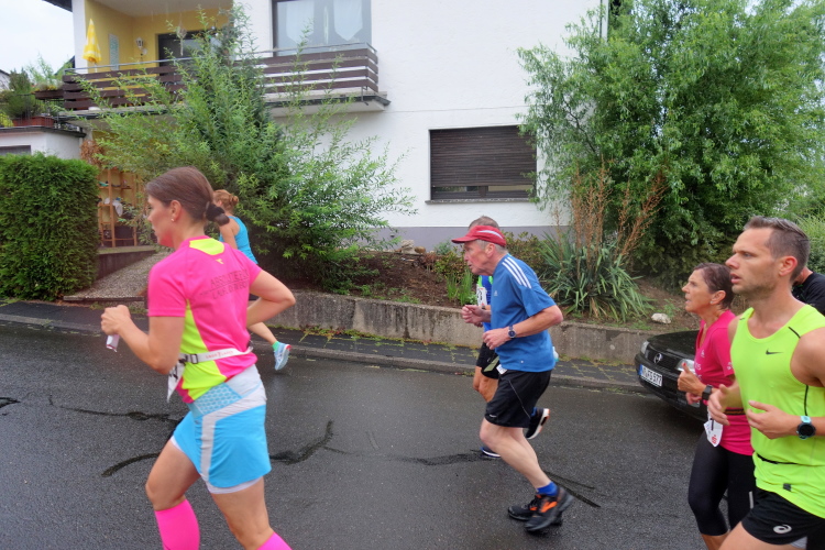 Der nächste Aufstieg kommt nach der Abwärtsraserei unerbittlich. Aber schon ist die Hälfte der Strecke vorbei. Ich konzentriere mich aufs Steigen und laufe soweit ich kann aufwärts. Dann aber wechsele ich wieder ins Gehen und steige bergan. Dabei merke ich, dass ich diesmal gut zu Fuß bin am Berg und zügig vorankomme. Da zeigen wohl meine Hügelrunden im Nümbrechter Kurpark Wirkung.