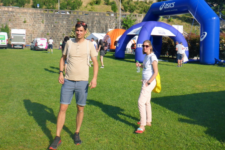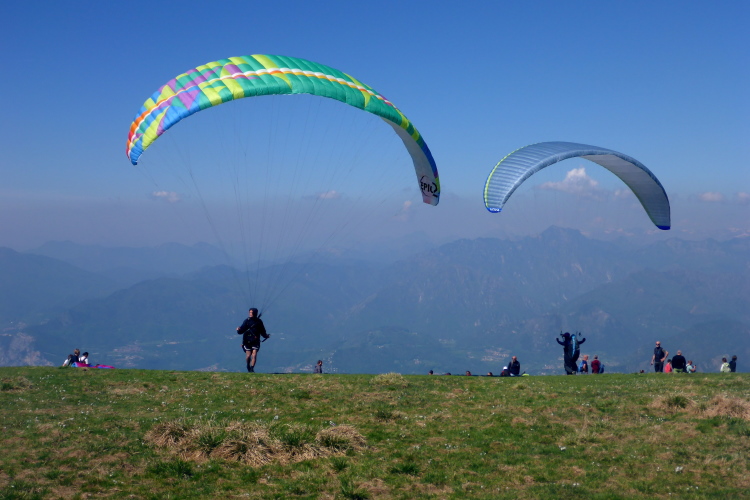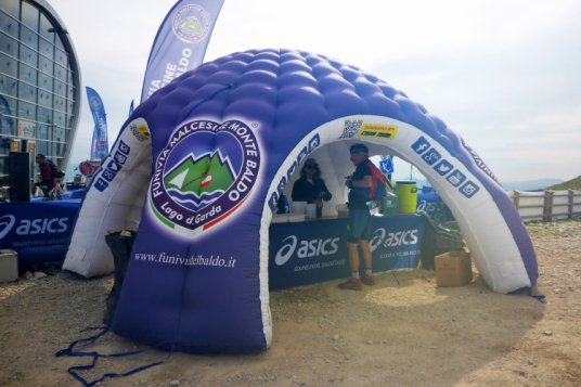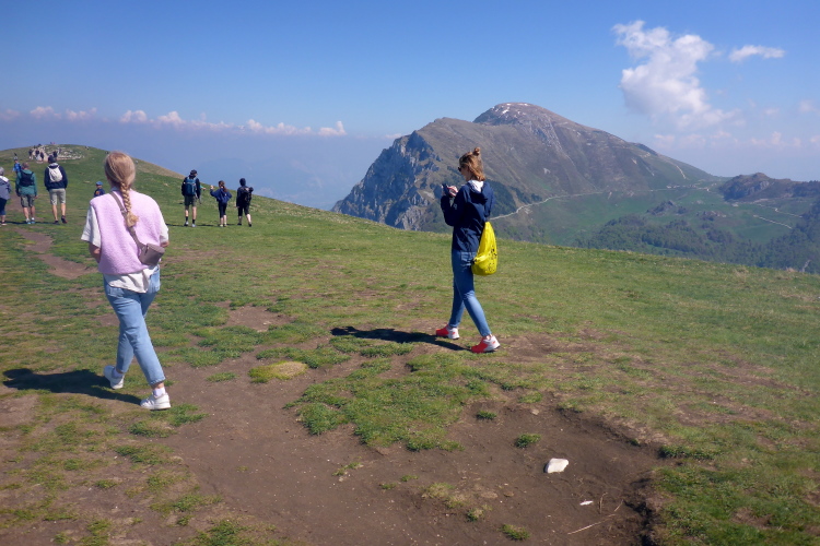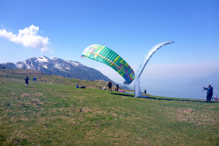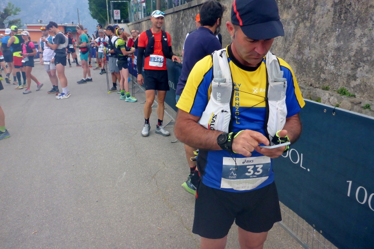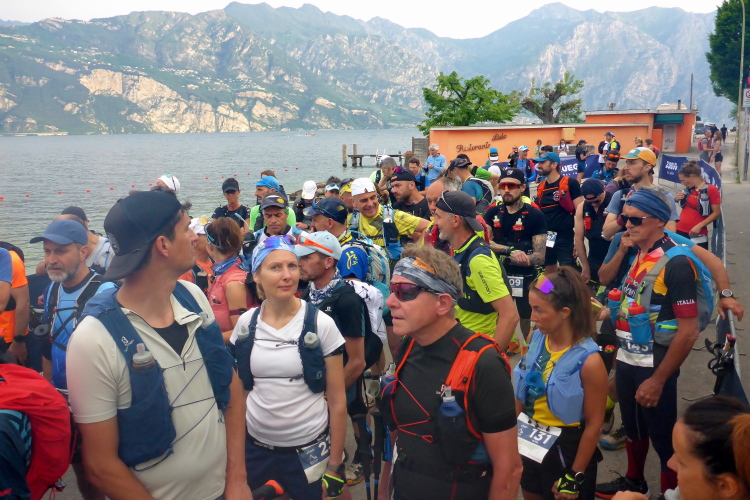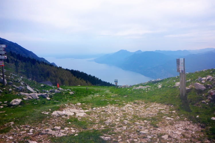 Am Donnerstag kommen meine Mitstreiter Buki, Astrid und Lukas an. Gemeinsam nehmen wir am Freitag die spektakuläre Gondel zum Monte Baldo (sie dreht sich beim Hochfahren einmal um die eigene Achse) und nutzen das sommerliche Wetter, um den fantastischen Ausblick auf den See und die umliegenden Bergketten ohne große Anstrengung zu genießen und schon mal zu schauen, wie sich die Bedingungen für das kommende Rennen darstellen. Wir schlendern über das weitläufige Hochplateau. Am Gleitschirm-Startplatz hängt schon die Streckenmarkierung für morgen. Das ist aber für die Kurzstrecke. Wir versuchen am gegenüberliegenden Berg die Wegführung unseres Trails zu erkennen, können aber keine Bänder oder Fähnchen entdecken.