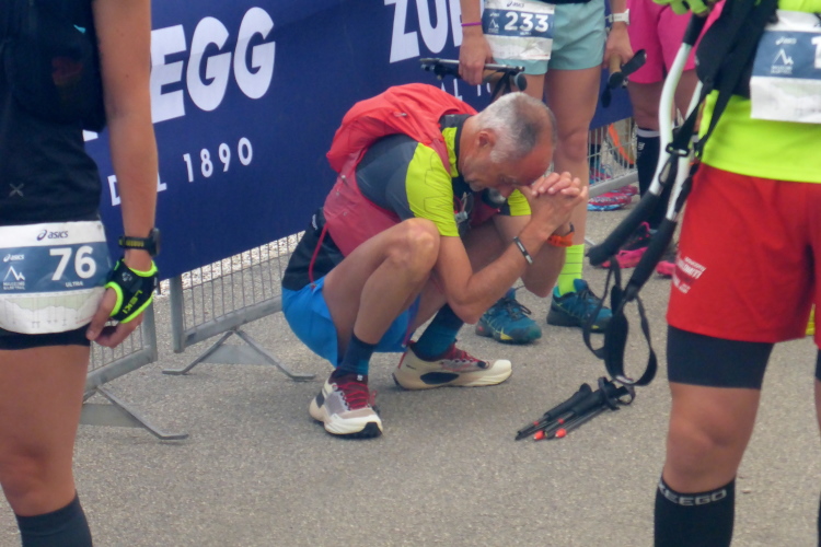 Wir laufen ein Stück über eine Straße und trinken gemeinsam das Bier, bevor es in den letzten harten Anstieg geht. Ich nehme noch ein Gel und schalte in den Automodus. Wir hören die Musik von der Bergstation und im Takt geht es nur noch nach oben. Stehen bleiben geht nicht. Mein Kreislauf lässt keine Pause mehr zu. 15 Minuten vorm Cutoff erreichen wir die Zeitmatte. Mein Kopf ist so leer, wie meine Trinkflasche. Wie in Trance fülle ich nach. Dann direkt weiter.