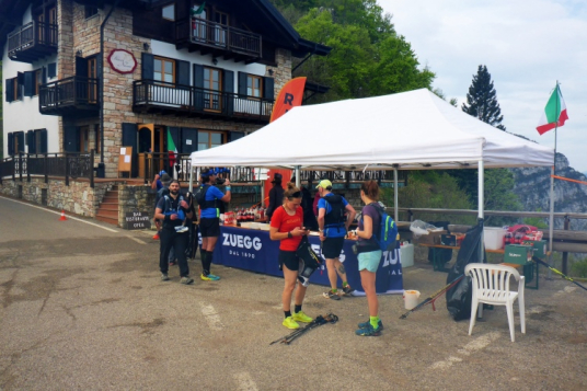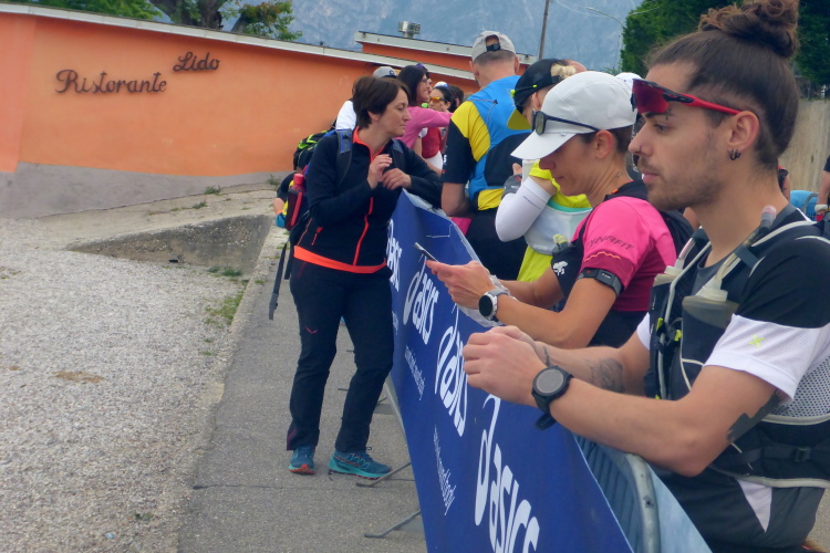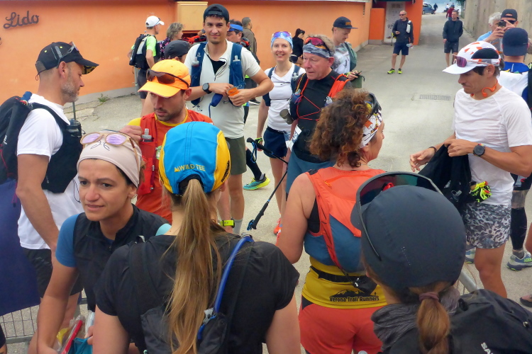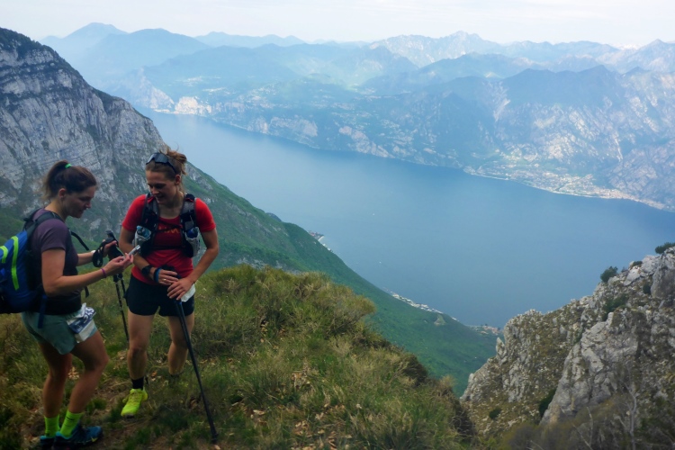 Nach 8 km überholen uns die ersten Eliteläufer der kurzen Strecke. Unglaublich, in welchem Tempo die Athleten diesen Anstieg hochrennen. Einen Kilometer später erreichen wir die erste Verpflegungsstelle an der Bocca di Navene. Wir haben schon 1500 Höhenmeter in den Beinen und ich bin dankbar für eine kurze Pause. Rechts von uns erkenne ich den Aussichtspunkt, von dem wir gestern über den Streckenverlauf gerätselt haben. Ganz anders als erwartet geht es weiter über den Grat zum Monte Altissimo. Der See liegt jetzt tief unter uns. Wir passieren immer wieder wunderschöne Aussichtspunkte, aber für eine Rast habe ich keine Lust und vor allem keine Zeit.