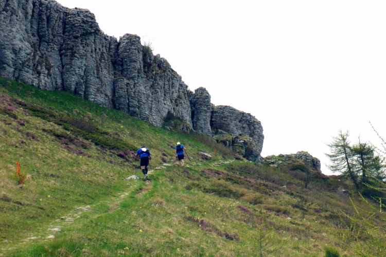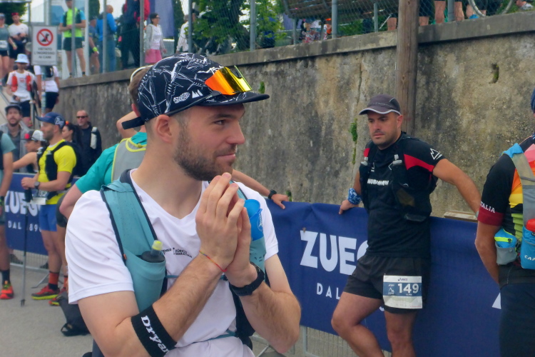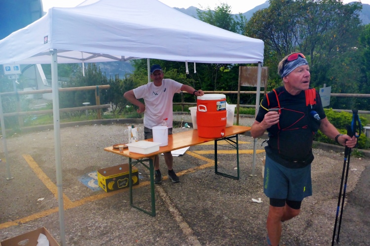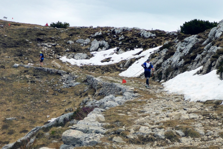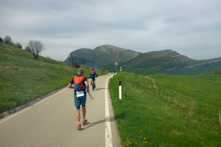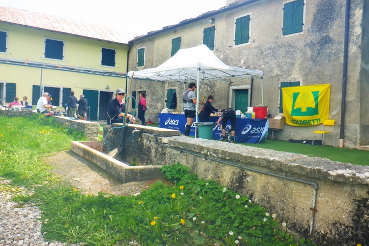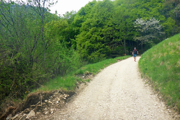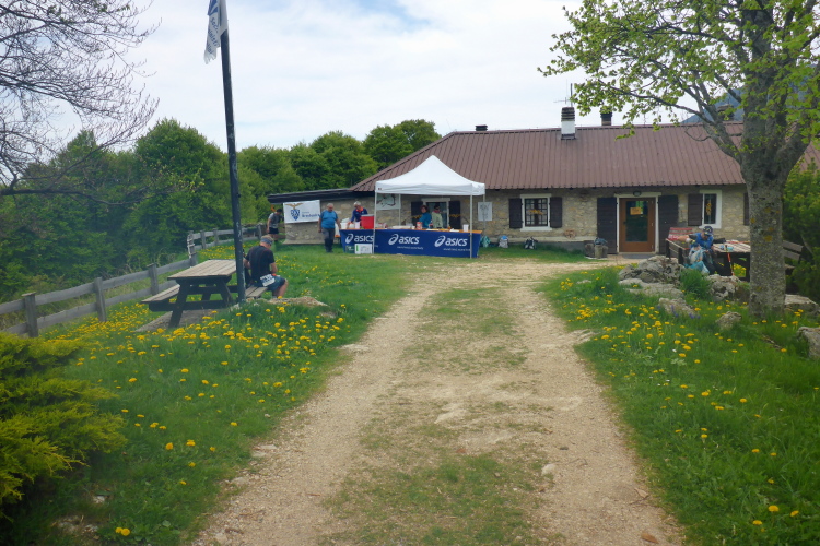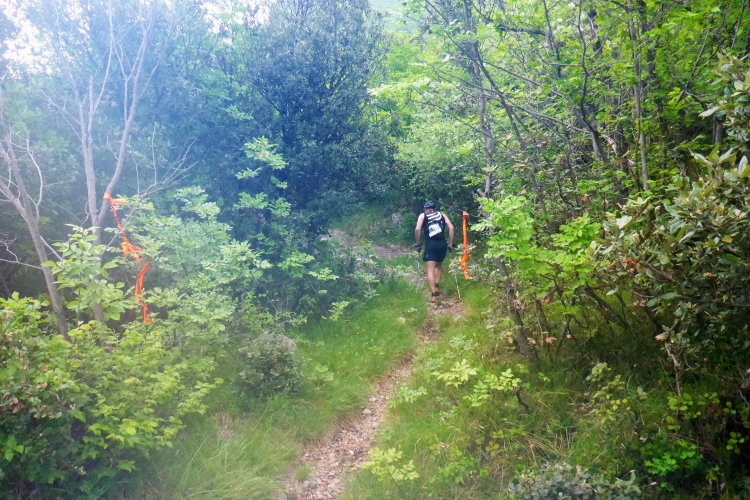 Bei Kilometer 29 kommt in Madonna de la Neve die nächste Verpflegung. Ich nehme ein Schluck Wasser und etwas Käse. Ab hier geht wieder in die Höhe. Über Weiden und Almen quäle ich mich Richtung Monte Baldo. Buki begleitet mich zum Glück. Allein könnte ich mich nicht mehr motivieren. So wie ich das Wasser in mich reinschütte, strömt es aus allen Poren wieder heraus.