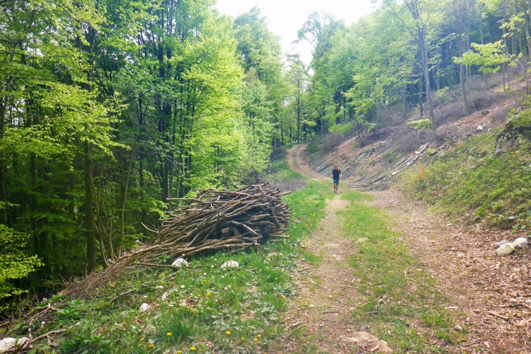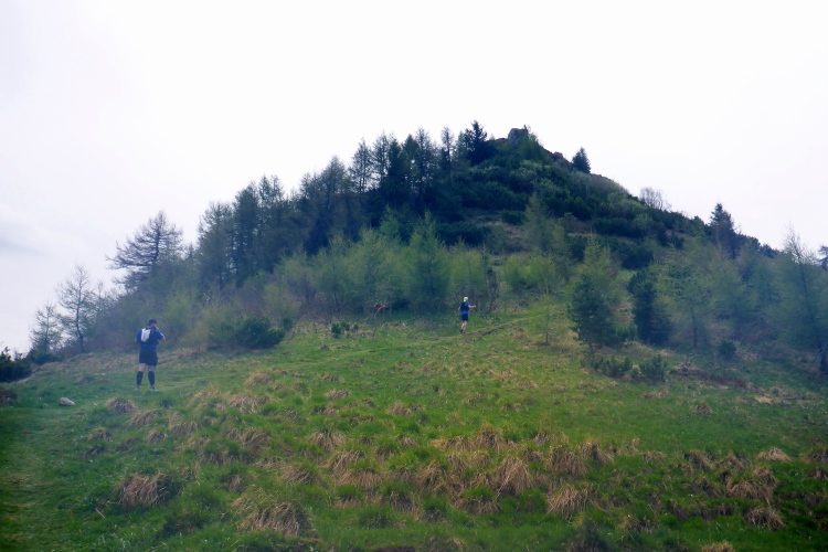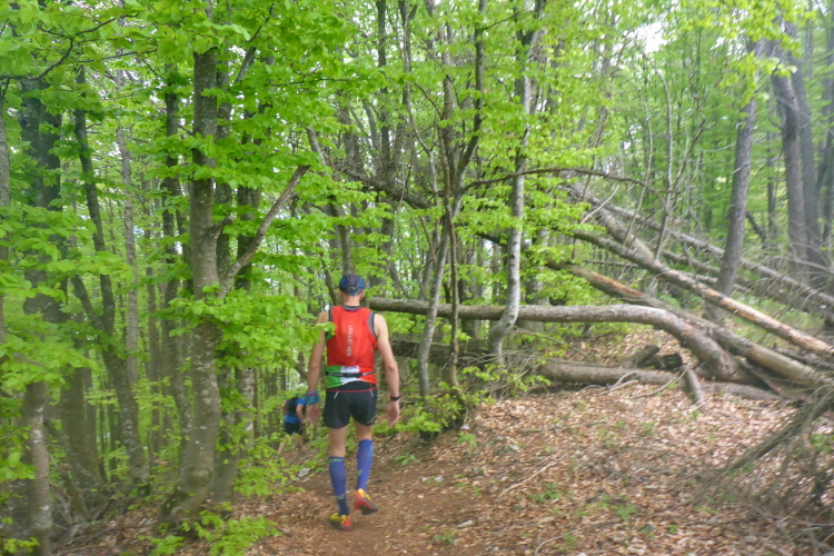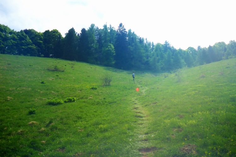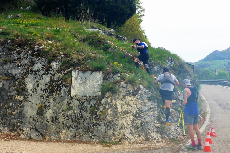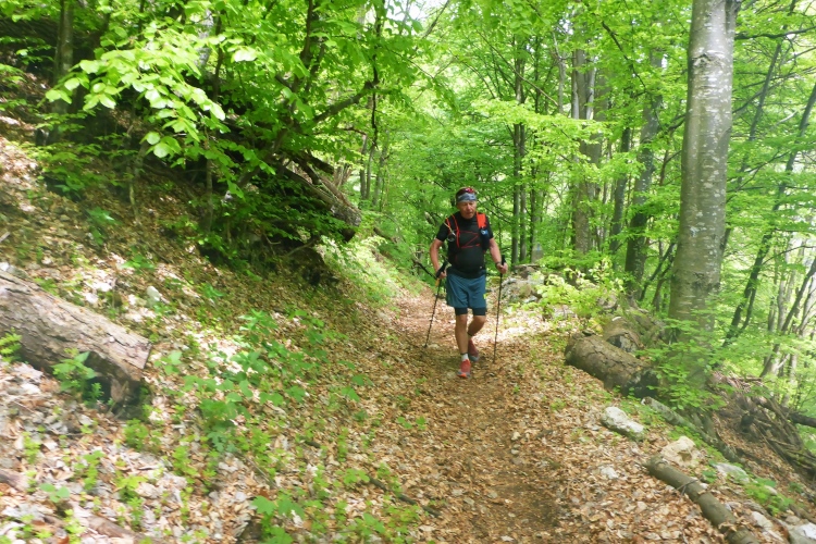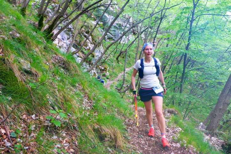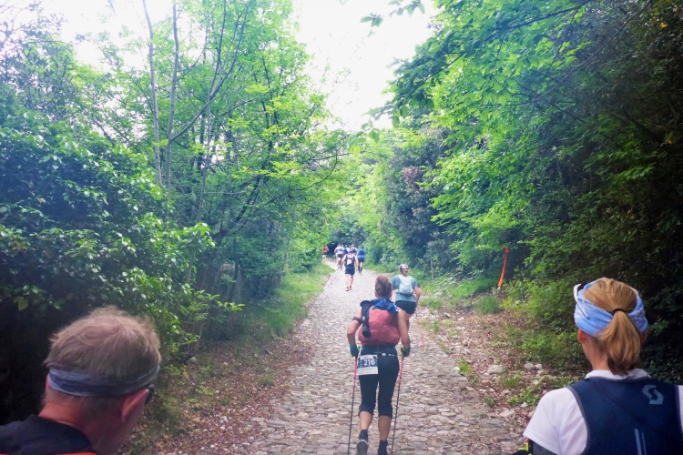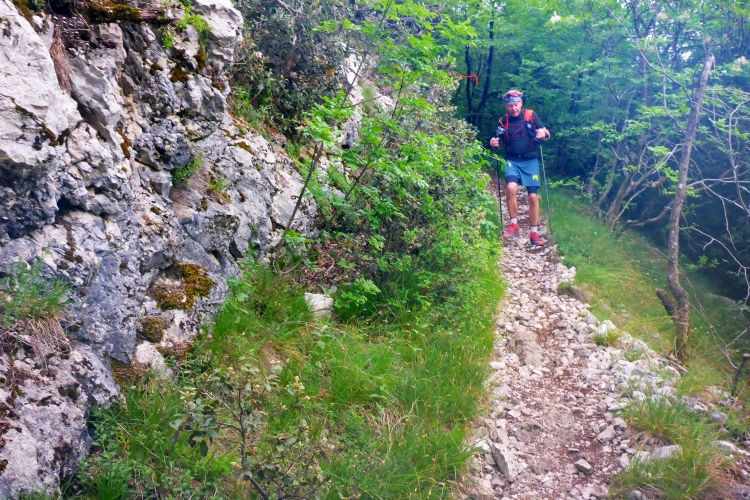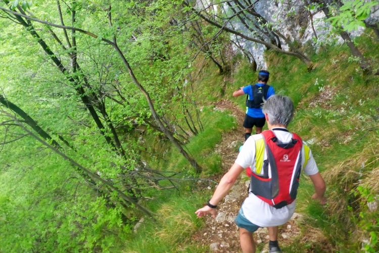 Bei Kilometer 29 kommt in Madonna de la Neve die nächste Verpflegung. Ich nehme ein Schluck Wasser und etwas Käse. Ab hier geht wieder in die Höhe. Über Weiden und Almen quäle ich mich Richtung Monte Baldo. Buki begleitet mich zum Glück. Allein könnte ich mich nicht mehr motivieren. So wie ich das Wasser in mich reinschütte, strömt es aus allen Poren wieder heraus.