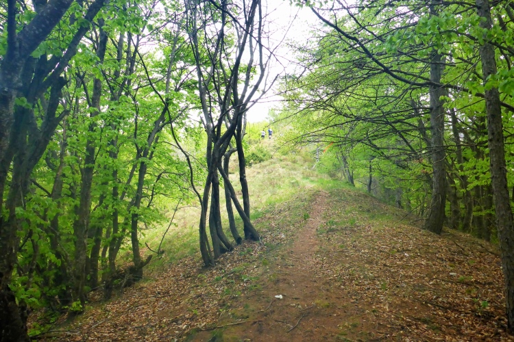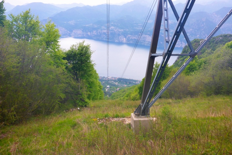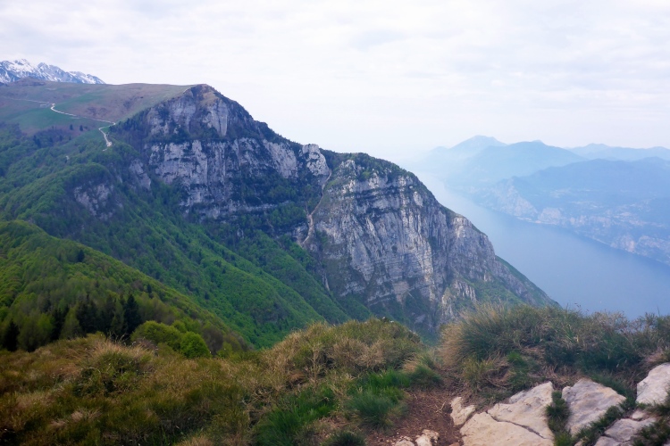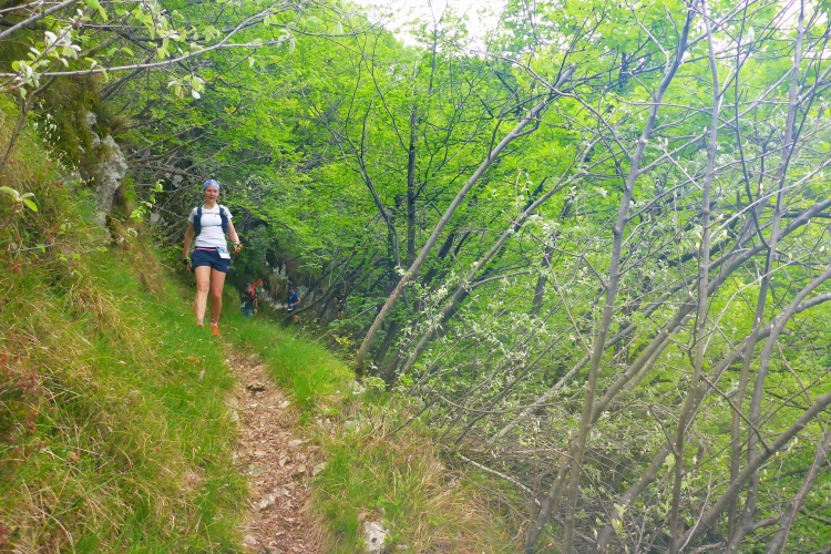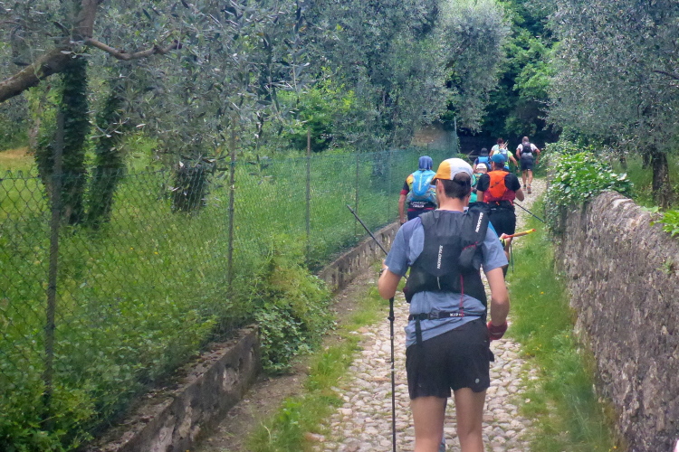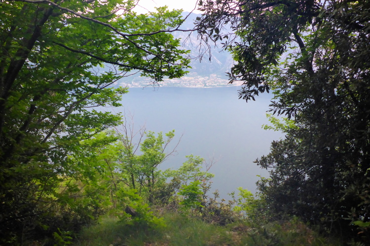 Ich bin einigermaßen aufgeregt und froh, als es pünktlich um halb acht losgeht. Nach fünfzig flachen Metern geht es gleich steil berghoch. Wir laufen ein Stück durch den Ort, passieren die Talstation der Seilbahn und winden uns auf sehr steilen Fahrwegen in die Höhe. Erst begleiten uns noch Olivenbäume, dann folgen lichte Buchen- und Kastanienwälder. Die Hüllen der Blüten werden vom Wind durch die Luft gewirbelt. Ab und zu ein schöner Blick auf den See unter uns. Wir gewinnen schnell an Höhe. Ich freue mich über jedes kleine flache Stück oder ein paar Meter Downhill. Meine Beine haben schwer zu kämpfen.