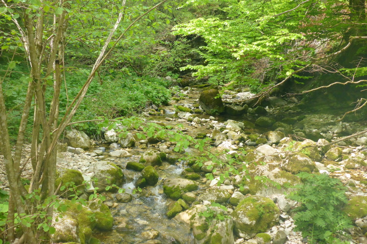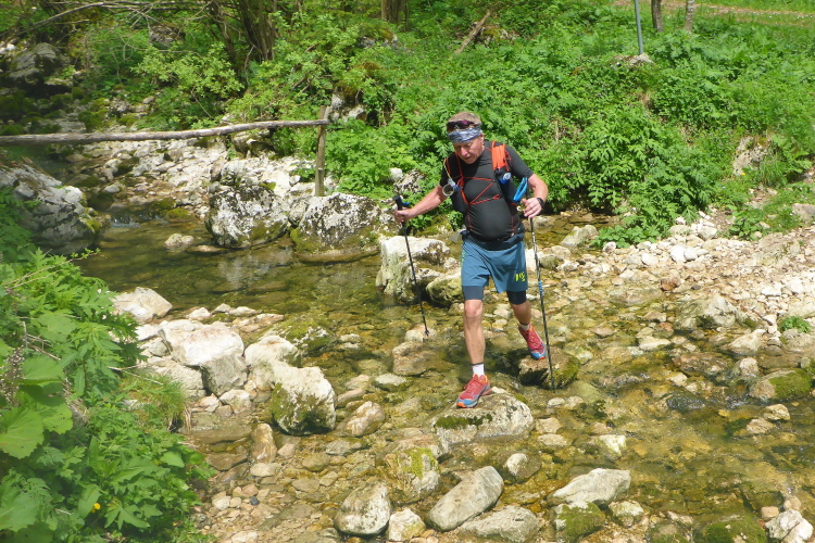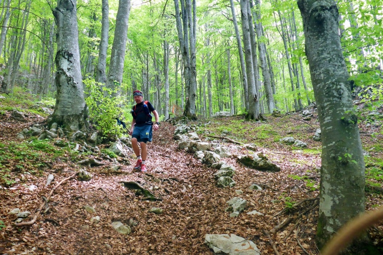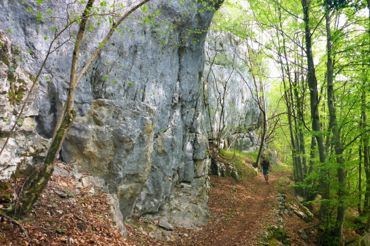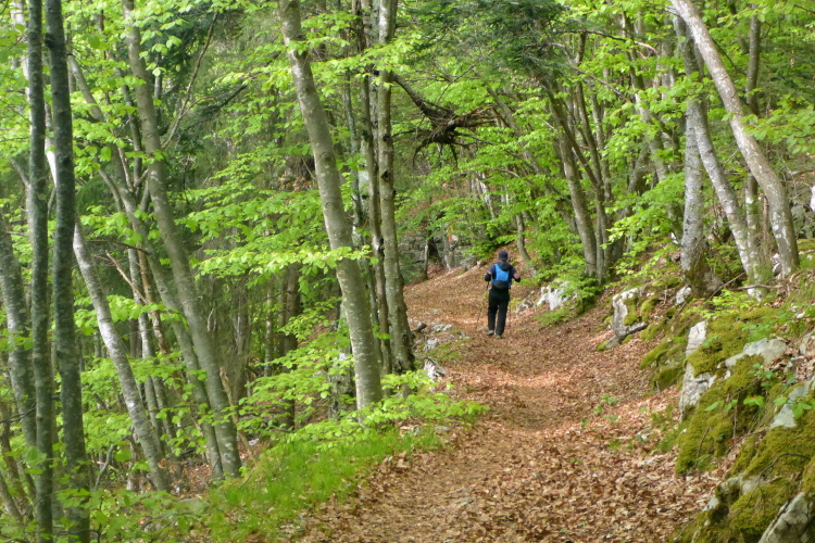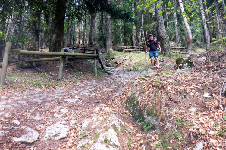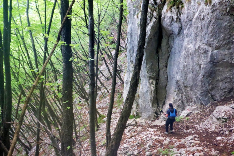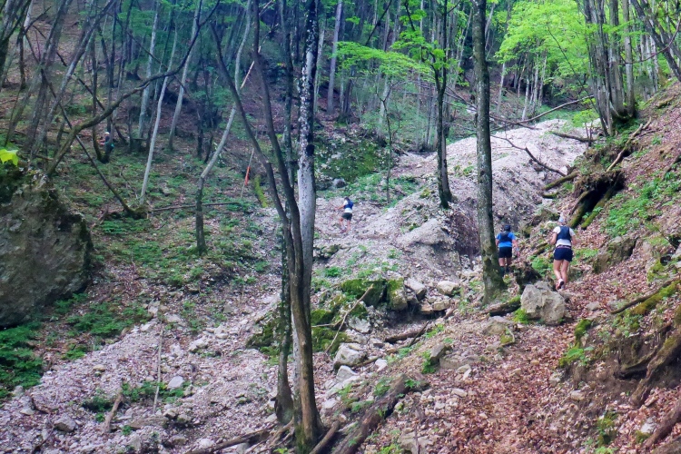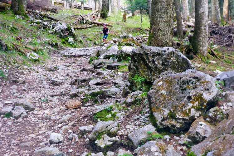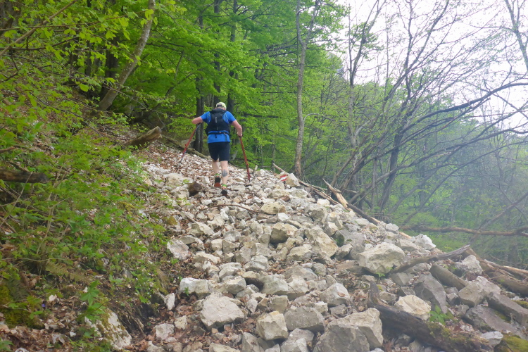 Die Luft wird zunehmend kühler. Trotzdem schwitze ich wie verrückt. Ich versuche von Anfang an viel zu trinken, was ich sonst gerne vergesse. Der Wald wird lichter. Ab und zu begleiten uns massive Felswände. Der Untergrund ist eine Mischung aus Laub und grobem Schotter. Aber alles in allem lässt es sich gut laufen. Oder besser steigen.