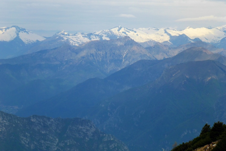Den Mittag verbringen wir bei gutem Essen auf der Terrasse einer Hütte. In der Sonne ist es angenehm warm. Wir haben einen spektakulären Ausblick auf die Adamello Gruppe und die Dolomiten bis zum Ortler. An der Bergstation der Seilbahn sehen wir dann doch noch einen Teil unserer Streckenführung. Hier kommen wir morgen bei km 38 vorbei. Von Dolce Vita ist nicht viel zu erkennen. Steil hoch, steil runter. Aber das war ja zu erwarten.