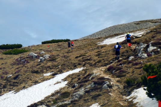 Über der Baumgrenze wird es frisch. Altschneefelder säumen den Weg. Meine Beine haben aufgehört zu meckern und schieben mich, etwas beleidigt zwar, aber immer noch kraftvoll nach oben. Ich schnaufe wie eine alte Dampflok und versuche ihnen so maximal Sauerstoff zu liefern. Die vier Wochen Ruhe haben sie träge werden lassen und sie müssen sich erst wieder an die Arbeit gewöhnen. Der Aufstieg will aber auch einfach nicht enden. Ich bin sehr erleichtert, als ich den Gipfel erreiche. 2300 Höhenmeter auf 12 Kilometer. Das hatte ich schon lange nicht mehr. Knapp vier Stunden habe ich bis hierher, der höchsten Stelle des Rennens, gebraucht. Jetzt geht es erst mal bergab.