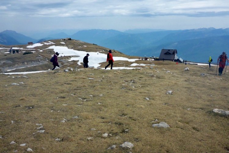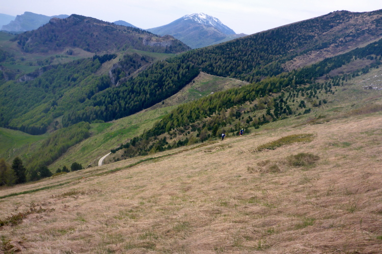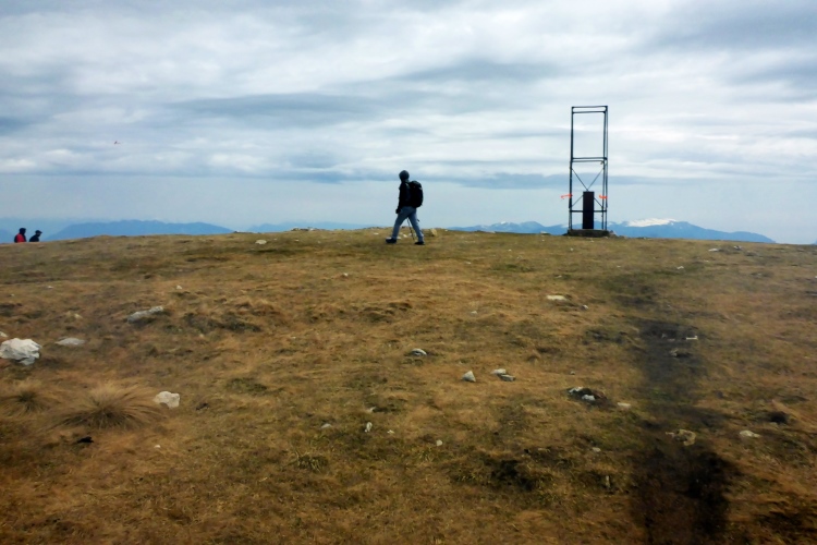 An der nahe gelegenen Hütte nehme ich einen Schluck Wasser. Es ist windig und kalt. Also schnell weiter. Der Downhill ist nicht ganz so steil und lässt sich gut laufen. Es geht über Wiesen und Weiden am Osthang des Monte Baldo entlang. Immer wieder bremsen kurze Gegenanstiege die Talfahrt.