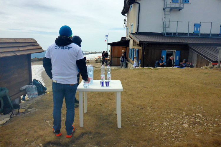 Kurz vor der Fos-Ce -Hütte bei Km 20, sehe ich Buki unter mir auf dem Fahrweg. Ich dachte, er wäre schon über alle Berge. Ich rufe ihn und gebe ein Zeichen, das er sofort versteht. An der Hütte erwartet er mich mit einem kühlen Bier. Das tut jetzt richtig gut. Wir haben 45 Minuten Vorsprung aufs Cutoff.