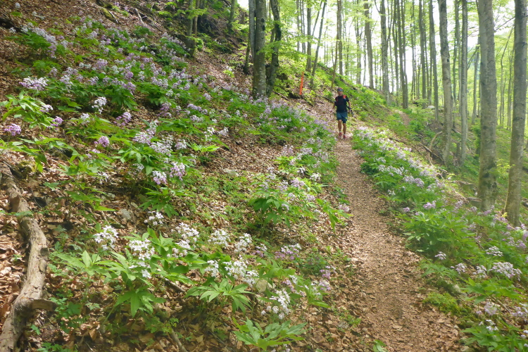 Die nächsten Kilometer hatte ich mir leichter vorgestellt. Es ist Mittag und nur wenige Wolken verdecken spärlich die Sonne. Es ist sehr warm und ich merke extrem das fehlende Training. Die Pfade sind oft sehr technisch und es geht ständig auf und ab. Ich finde keinen vernünftigen Rhythmus und es fällt mir zunehmend schwerer, in Bewegung zu bleiben.