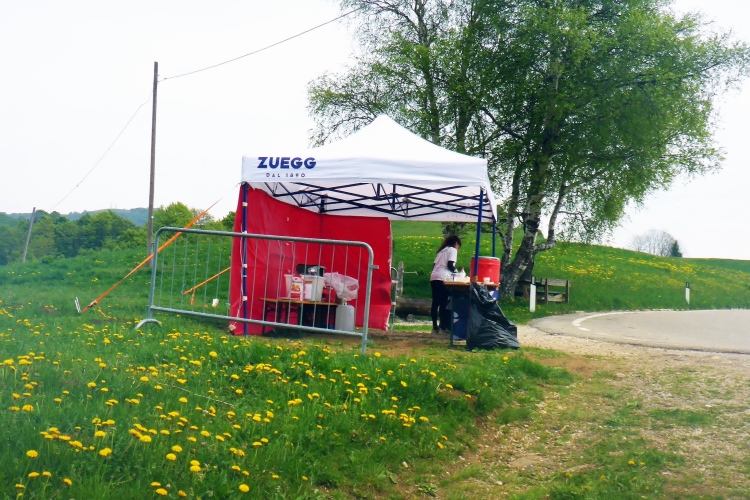 Ich schaue nur noch vor die Füße und stemme mich den Berg hoch. Unser Vorsprung aufs Cutoff schmilzt wie Schnee in der Sonne. Ich sage Buki, er soll ohne mich weiterziehen, da ich nicht weiß, ob ich es schaffe, aber er bleibt einfach hinter mir. Zu allem Elend will die nächste Verpflegung einfach nicht kommen. Auf meiner Uhr müsste sie schon lange da sein. Einen Kilometer weiter, wie angekündigt, sind wir dann endlich in Prà Alpesina. Wir haben noch 5 Minuten zum Cutoff. Ich fülle schnell die Flaschen und nehme noch eine Dose Bier in den Rucksack, dann geht es direkt weiter. Bis zum letzten Cutoff an der Bergstation der Seilbahn, haben wir nur eine Stunde Zeit. Das muss jetzt einfach klappen.