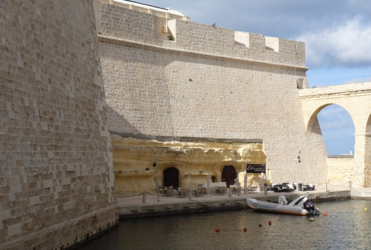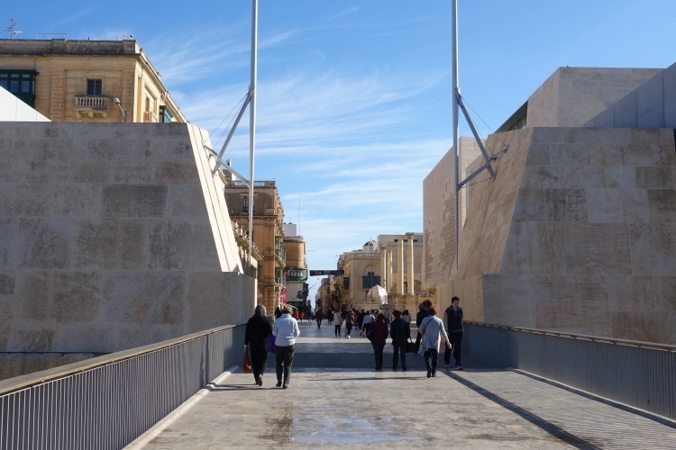 Ein Beispiel durchweg moderner Architektur ist das brandneue, ebenfalls von Renzo Piano entworfene Parlamentsgebäude am Eingang zur Hauptstadt, wegen seiner Oberflächengestaltung von den Maltesern auch „cheese grater“ („Käsereibe“) genannt. Wir werden nach der ersten Bastion hinab zum Meer geführt. Höhe 0 ist erreicht. Nach meiner Messung ging es 270 Höhenmeter bergab und 120 Meter bergauf.