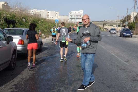 Genießen wir einen letzten Blick auf Mdina, das uns jetzt über 22 km begleitet hat. Kurz vor km 26 stoßen wir wieder auf die Triq L-Mdina mit ihren Baumreihen. Triq heißt einfach Straße; diese kommt von Mdina her, ebenso wie eine große Schar von langsamen Halbmarathonis und Walkern. Das kurz hintereinander liegende „Trio“ aus Wasserstelle, Iso-Stelle und Schwammverteilung kennen wir noch von km 6, Vorräte sind dort auch jetzt noch reichlich vorhanden. Bei den Schwämmen gäbe es auch einige Toilettenhäuschen, ebenso noch mal bei km 32.