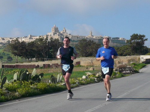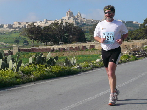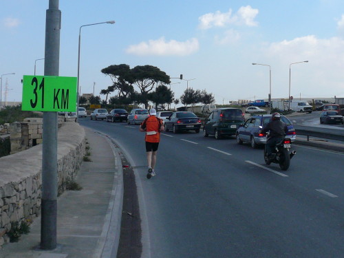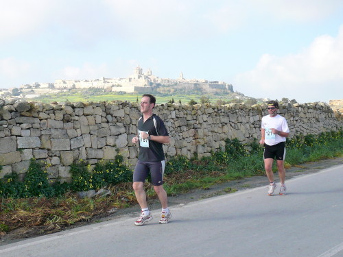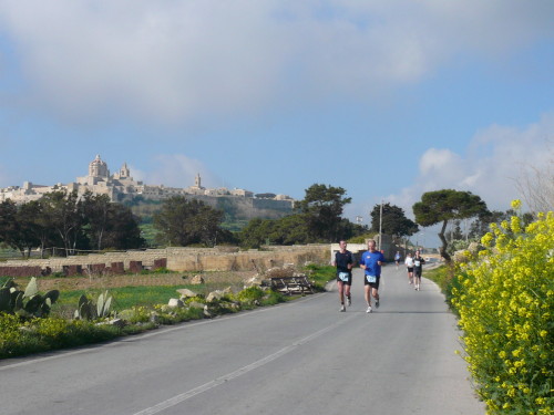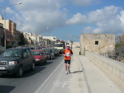 Die Strecke führt jetzt angenehmerweise abwärts. Trotzdem kann ich es nicht so recht rollen lassen. Der Streckenabschnitt gehört nämlich für mich zu den schönsten überhaupt. Dreht man sich um, hat man einen phantastischen Blick auf den mit der Festung und der Cathedrale „gekrönten“ Hügel. Genau dieses Motiv hat mich motiviert, 2004 meine erste Marathon-Auslandsreise hierher nach Malta zu machen. Ich bin heute so fasziniert wie damals.