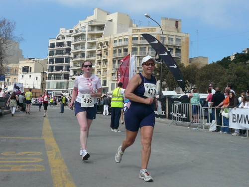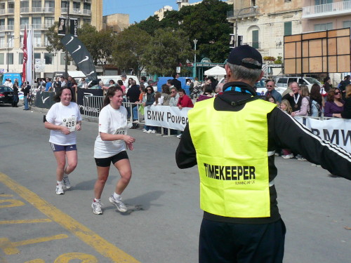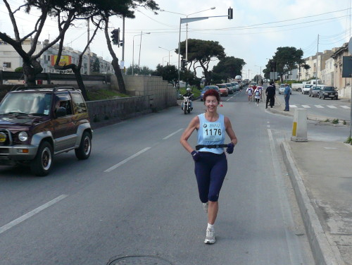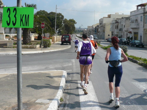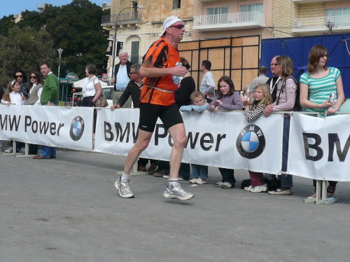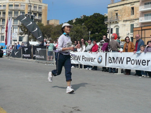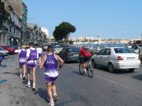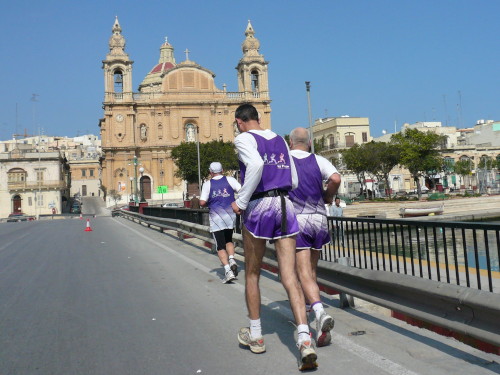 Links liegt Qormi und die Sportanlagen von Marsa. Bei km 35 und 36 sind noch einmal zwei Steigungen, die bei der ungewohnten Wärme vielen eine Gehpause aufzwingen. Dann wird Floriana, die Vorstadt von Valetta erreicht und Marsamxett Harbour. Der Blick geht auf den Hafen und die Festungsmauern. Dann läuft man direkt auf die dem Heiligen Josef geweihte herrliche Kirche zu.