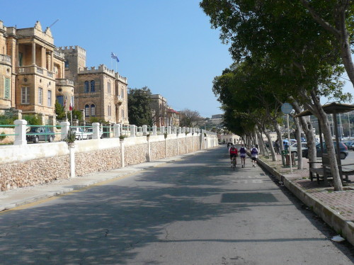 Rechts geht es auf die Uferpromenade Richtung Sliema. In den prachtvollen Villen und Palästen haben sich die Botschaften verschiedener Länder niedergelassen. Noch sind zwei Kilometer zu laufen. Palmen säumen die Straße, der Blick geht nach Valetta  mit der Cathedrale und der Festung. Jetzt gibt es sogar ein paar Zuschauer, die begeistert sind von der Anstrengung der Läufer.