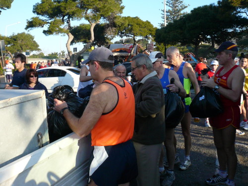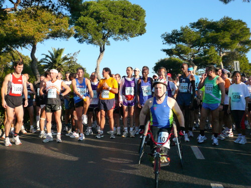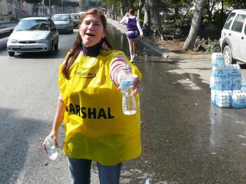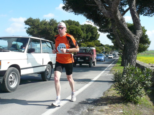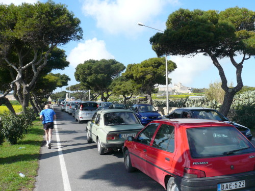 Dabei ist es ganz klar, die Organisatoren werden wegen 300 Marathon- und 600 Halbmarathonläufern  nicht die Straße sperren dürfen, auf der am Sonntagmorgen viele tausend Menschen unterwegs sein wollen. Man muss sich arrangieren und das funktioniert auch ganz gut. Die Autofahrer, denen man in den südlichen Ländern mehr Temperament als Disziplin nachsagt, nehmen die Behinderungen klaglos hin. Das Hupen gilt entweder einem eingepennten Fahrer oder einer attraktiven Läuferin.