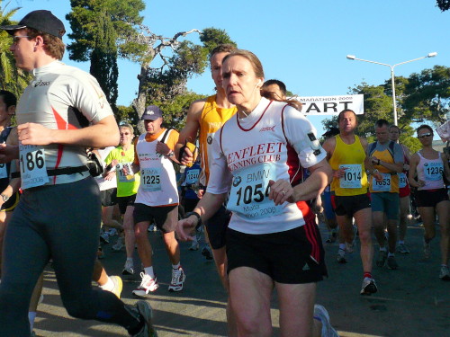 Die Sonne scheint, Anja’s Thermometer zeigt knappe 12 Grad an (im Tagesverlauf werden es gut 20). Da komme noch nicht einmal ich auf die Idee, in langen Hosen zu starten. Bestimmt über die Hälfte der ungefähr 300 Läuferinnen und Läufer kommen aus Deutschland. Viele Engländer sind da, Italiener natürlich und selbstverständlich auch Einheimische. Pünktlich um 8.00 Uhr geht es mit Musik auf die Strecke.