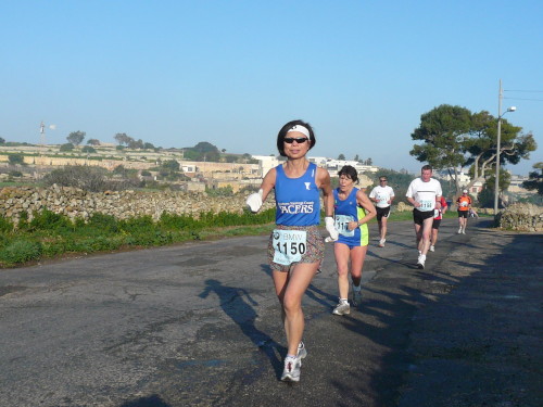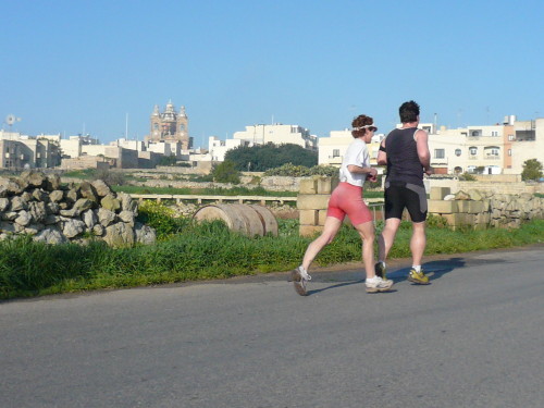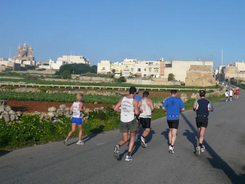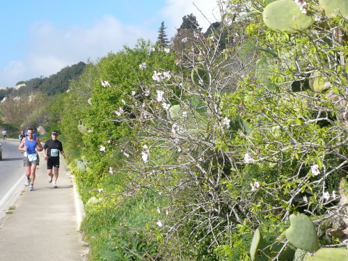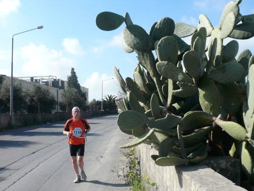 Man sollte den Malta Marathon nicht unterschätzen. Zwar hat die Gesamtstrecke von Mdina bis Sliema deutliches Gefälle, aber zwischendrin sind etliche Steigungen, die besonders am Schluss für manchen Fluch verantwortlich sind. Die ersten Steigungen bis Rabat (km 3) nehmen wir ausgeruht fast nicht zur Kenntnis. Buskett Garden ist nur ein kleines Wäldchen und wird kaum beachtet, ist aber Maltas größtes Waldgebiet. Hier in der Nähe hat man Karrenspuren aus der Bronzezeit gefunden. Wir laufen an mit Steinmauern oder Kakteen geschützten kleinen Feldern und Wiesen vorbei Richtung Dingli, bekannt durch die Dingli Cliffs genannte Steilküste.