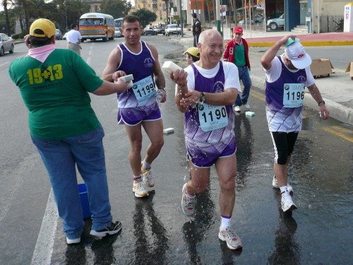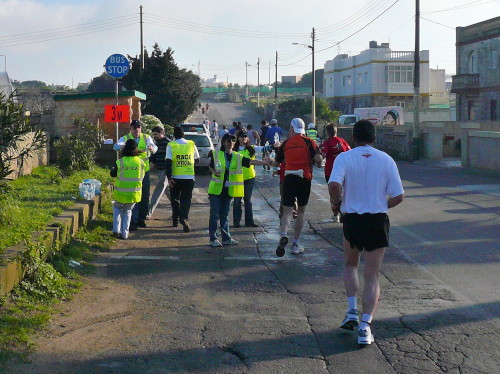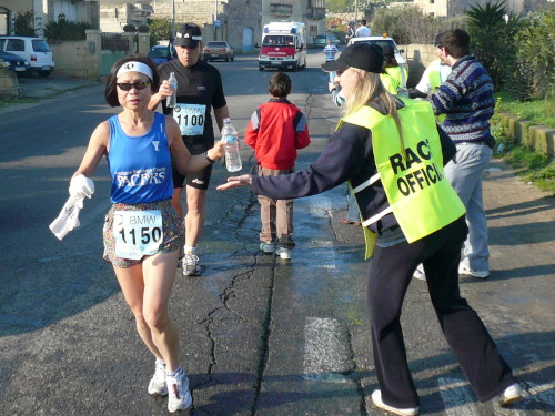 Nach knapp 5 Kilometern erreichen wir die erste Getränkestelle. Man muss wissen, beim Malta Marathon verdurstet man auch bei großer Hitze nicht, es gibt ausreichend Wasser (in Flaschen) zu trinken und Schwämme, zweimal auch Powerade. Einmal gibt es Orangen, mehr  nicht. Wer also gewohnt ist, etwas zu essen, sollte sich etwas mitnehmen.