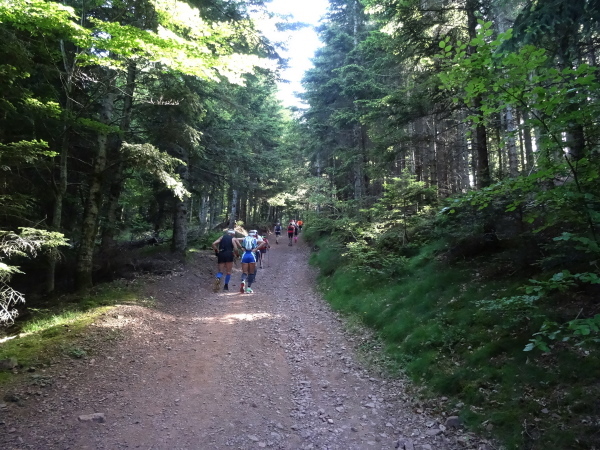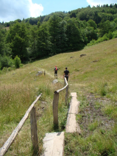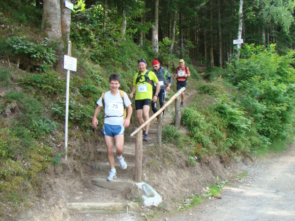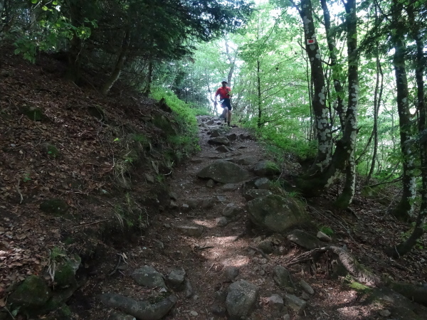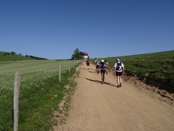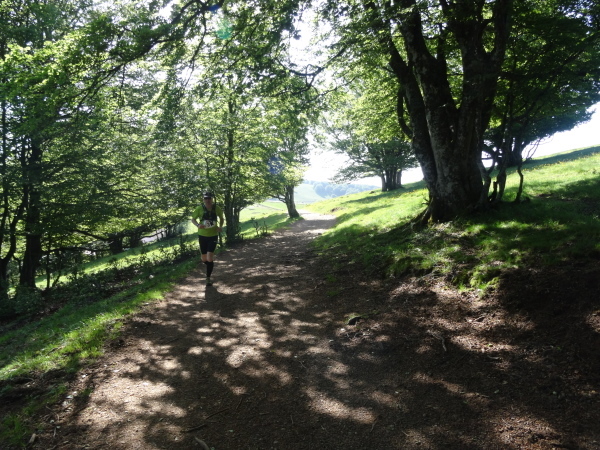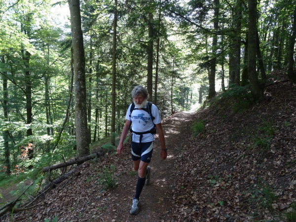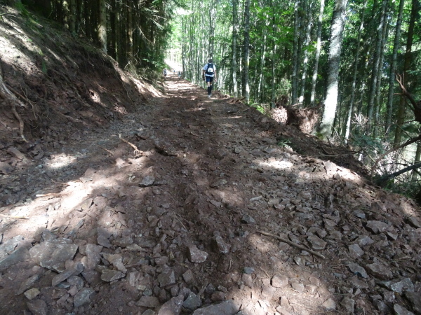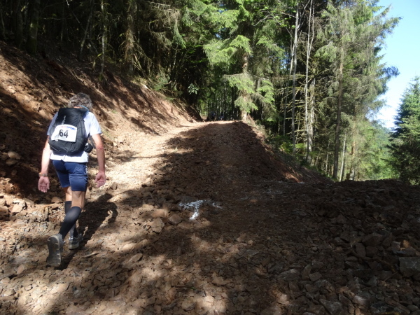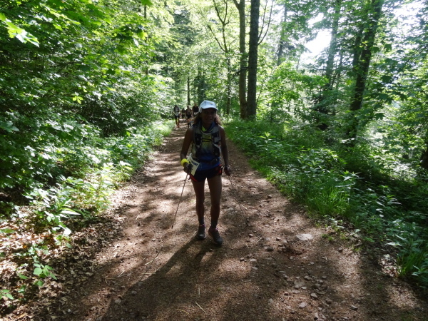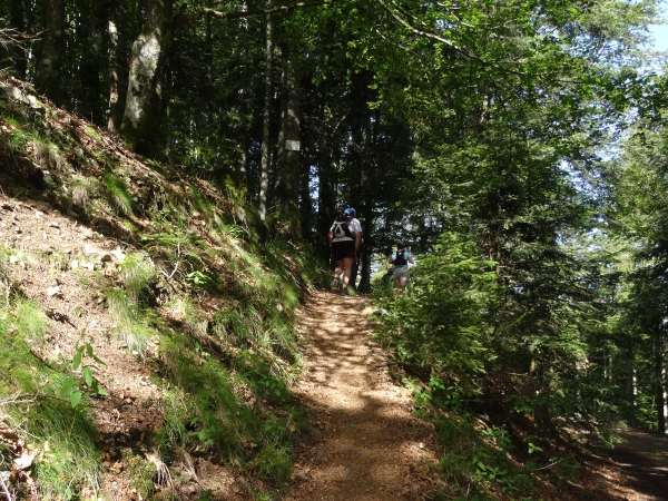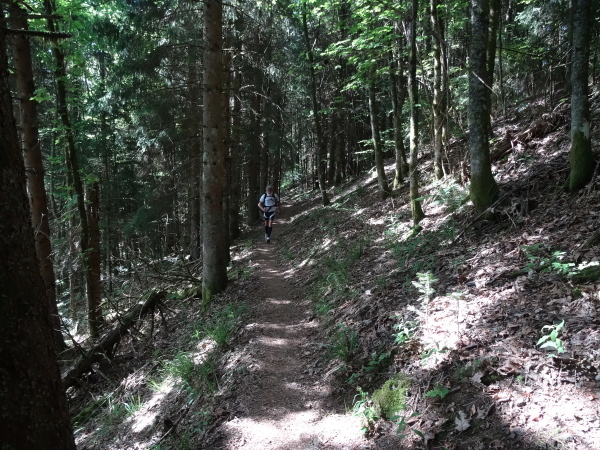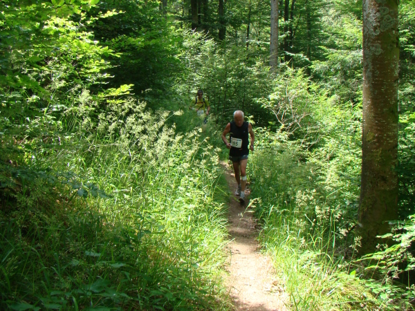 Hat man die Wiese überlaufen, geht es in einen Wald und auf einem schmalen Pfad bergab zu einer Holztreppenbarriere, bevor erneut Viehweiden und steile Hangwiesen auf die Trailer warten. Am „Col du Rimbach“ auf 946 m erreicht man dann die Erste von vier Verpflegungsstellen.