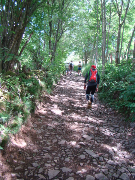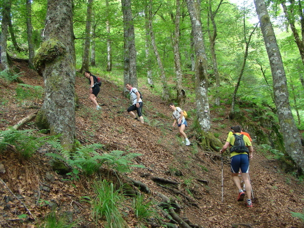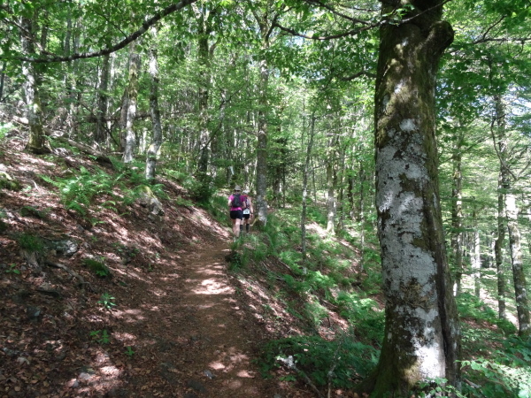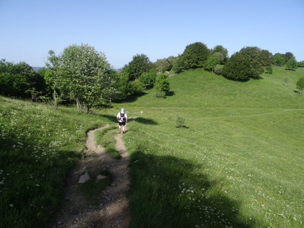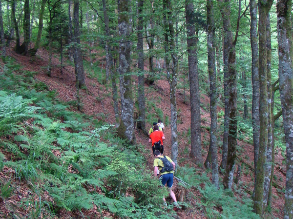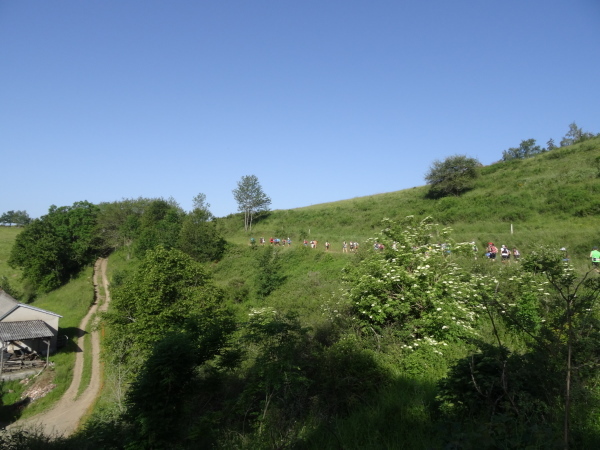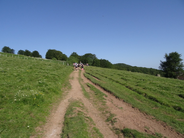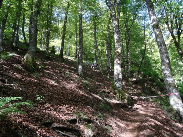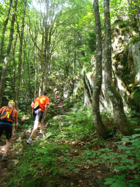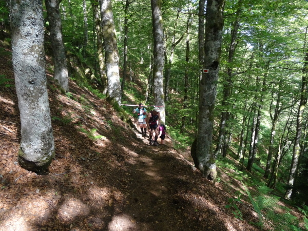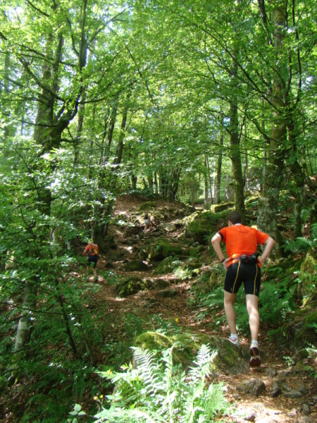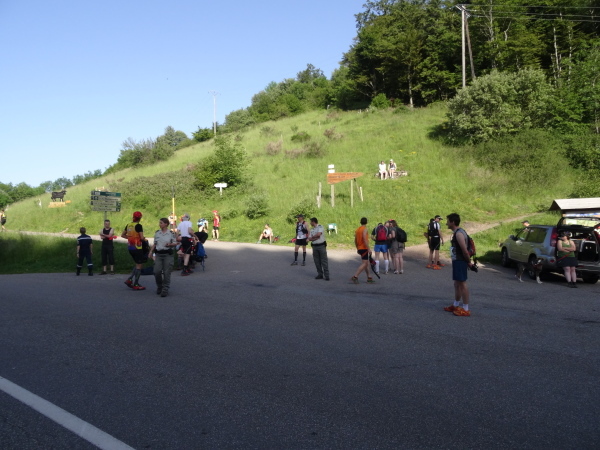 Hat man die Wiese überlaufen, geht es in einen Wald und auf einem schmalen Pfad bergab zu einer Holztreppenbarriere, bevor erneut Viehweiden und steile Hangwiesen auf die Trailer warten. Am „Col du Rimbach“ auf 946 m erreicht man dann die Erste von vier Verpflegungsstellen.