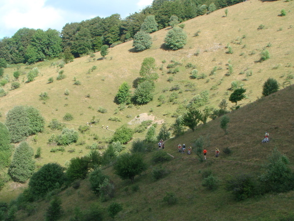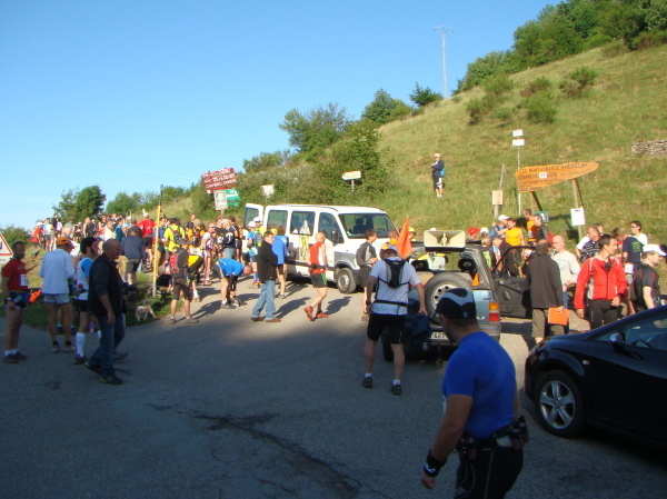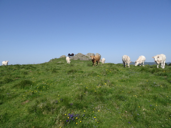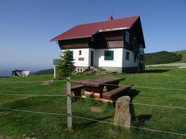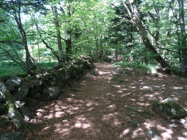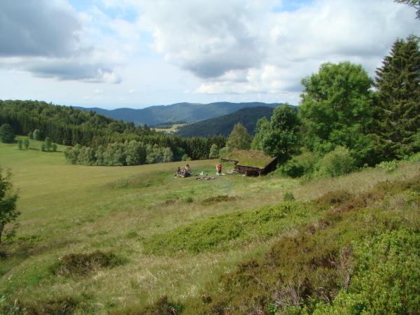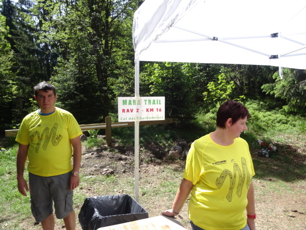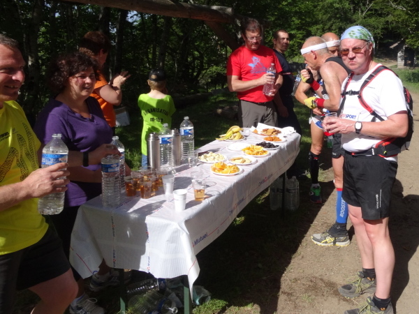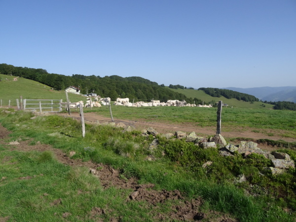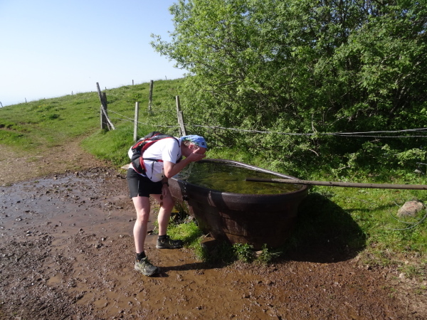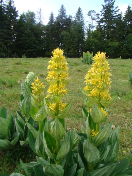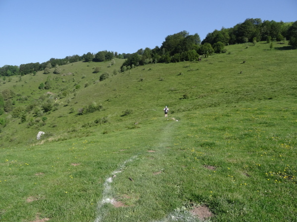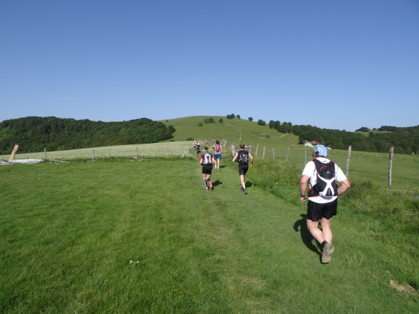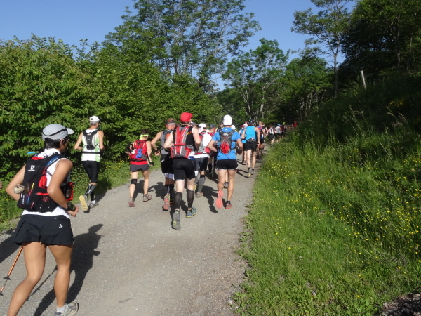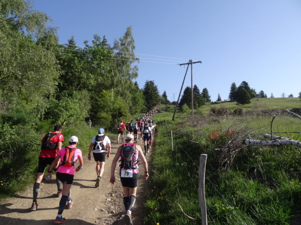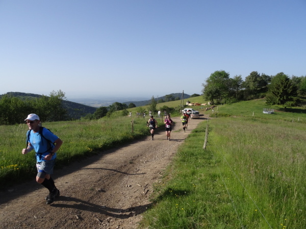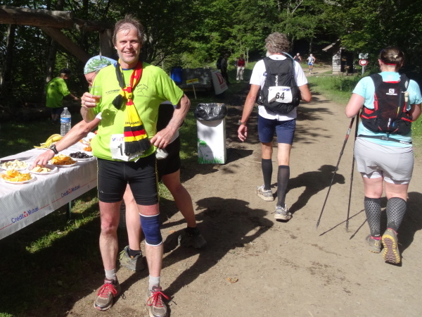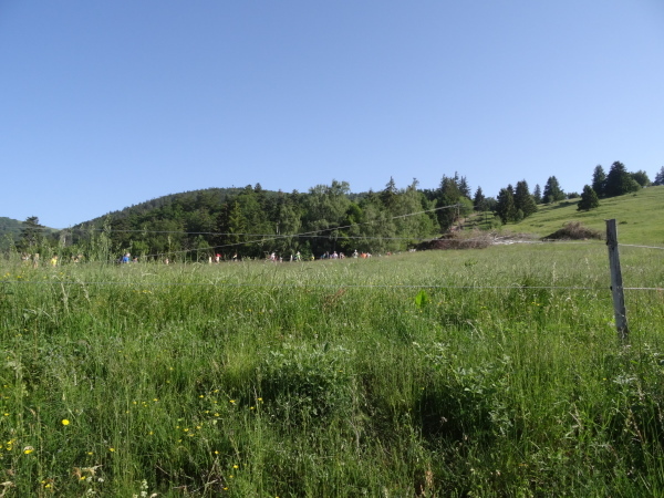 Das schwierigste der Strecke ist abgearbeitet. An der „Auberge du Ballon d`Alsace“ bei Km 22 steht dann die dritte VS mit allerlei Leckereien. Der weitere Weg geht lange Zeit über Weiden und Wiesen, vorbei an der „Refuge de la Gentiane“ und dann leicht bergan über eine bunte Bergwiese mit unzähligen, 50 cm hohen, gelben Enzian. Immer weiter geht es auf einer weiteren baumlosen Kuppe bergan. Kaum ist der Scheitel erreicht, geht es sofort bergab und wenig später taucht man wieder in einen Wald ein.
