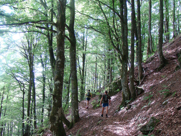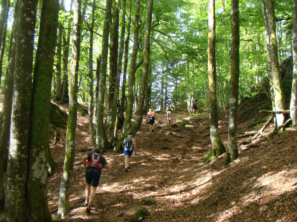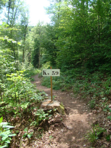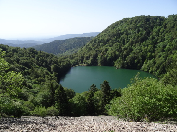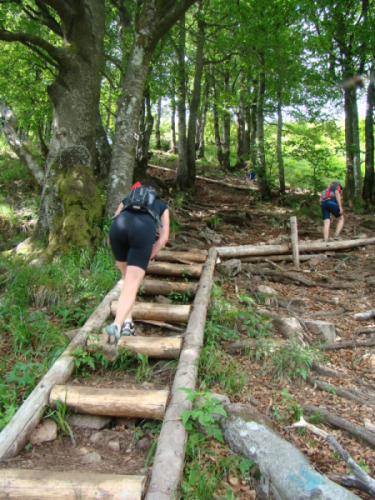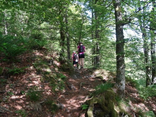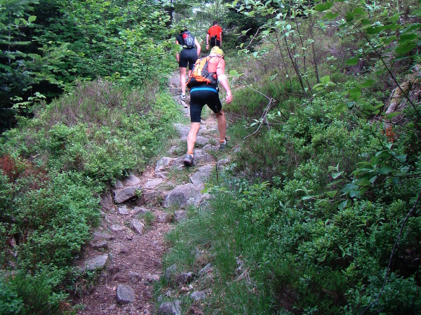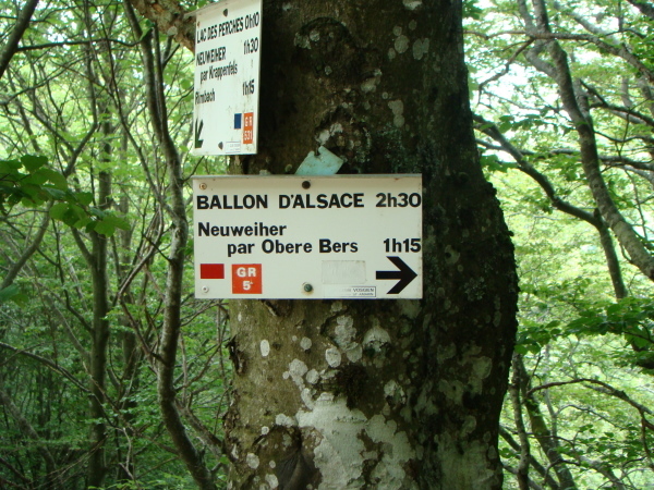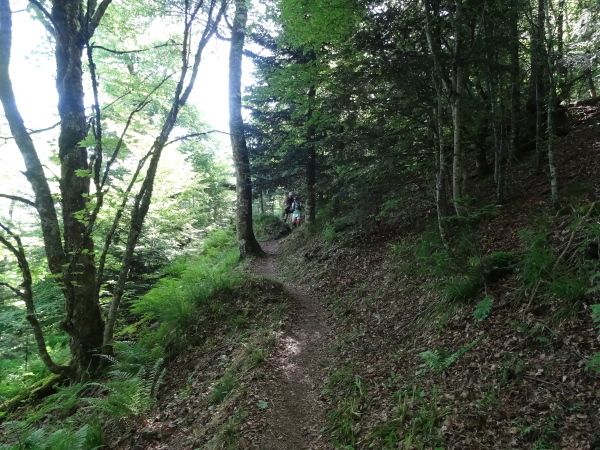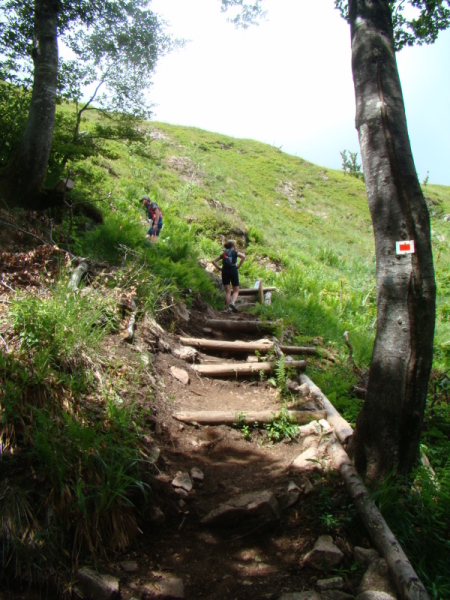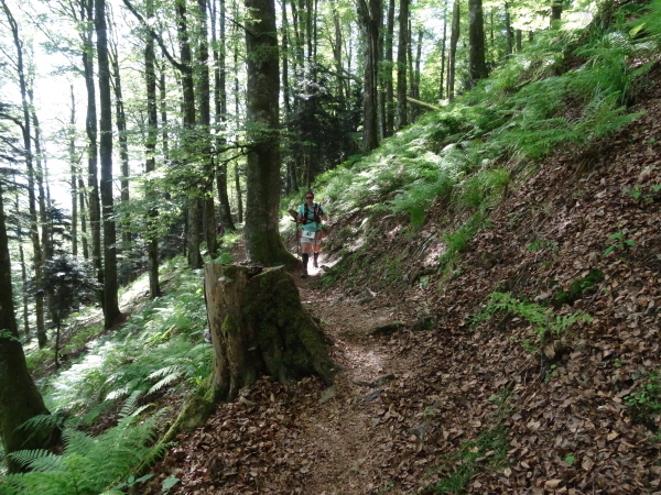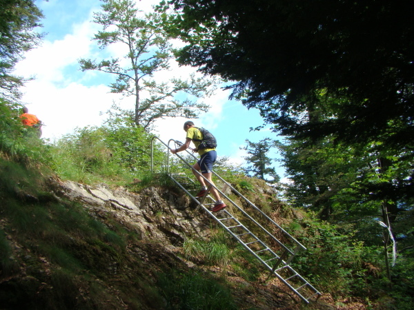 Wieder im Wald, geht es auf schmalen Pfaden zum „Col du Ternsee“ und zum „Lac des Perches“. Eine kleine Felsanhöhe muss sogar über eine Stahlleiter erklommen werden. Im ständigen Auf und Ab im lichten Wald und am Hang über Wurzeln und Felsen, gilt es nun den „Rimbachkopf“ auf 1195 m zu erklimmen.