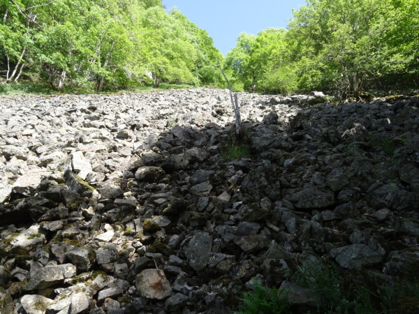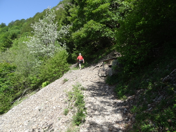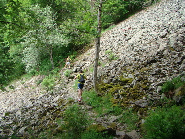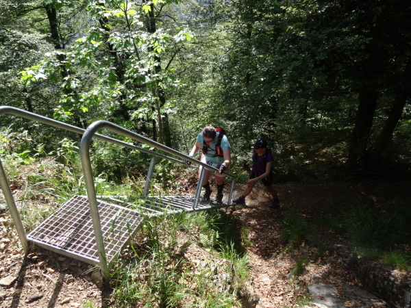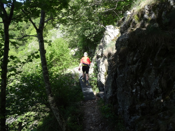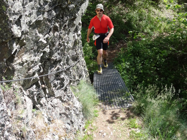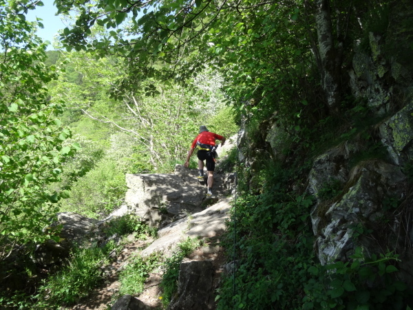 Immer spektakulärer wird mittlerweile die Laufstrecke. Über einen Felshang mit Gitterrosten und ausgesetzten Stellen gelangt man dann bis oberhalb des „Lac des Perches“. Der weitere Weg führt dann über zwei Schuttfelder und wieder steil bergan. Am „Col des Charbonniers“ auf 1115 m erreicht man dann die zweite VS. Immer anspruchsvoller wird der Pfad. Hier muss immer mehr der sichere Tritt gesucht werden.