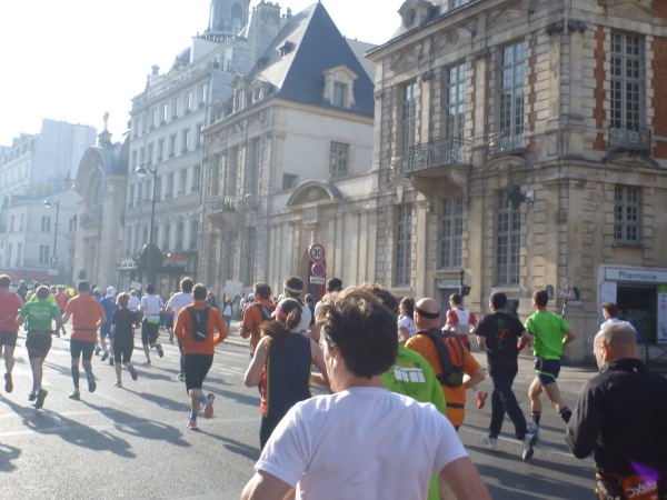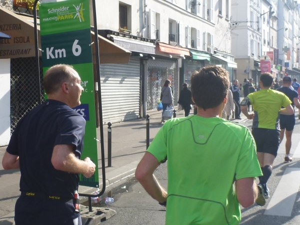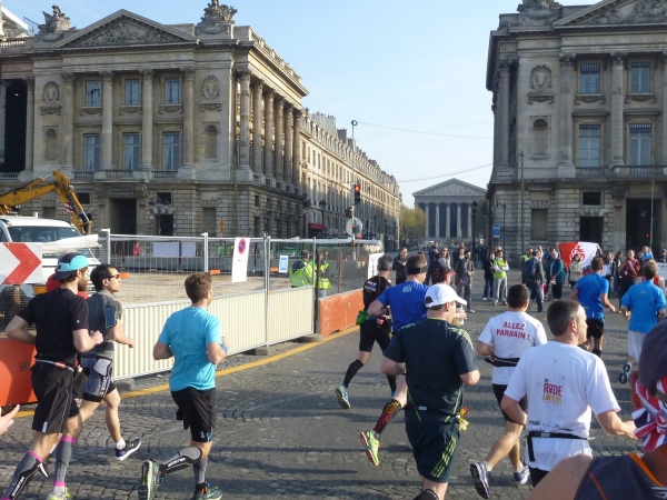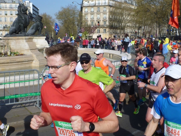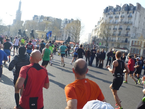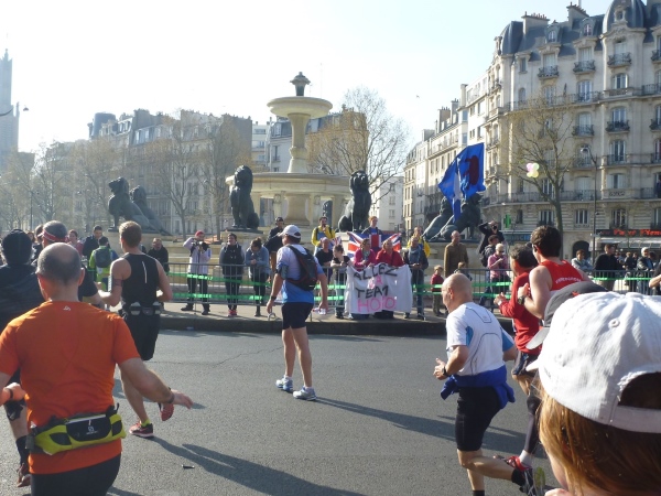 An der Oberfläche geht es richtig rund: links die erste Verpflegungsstelle, drum herum Tausende von Zuschauern. Weiter geht es in Richtung Osten durch die Stadt. Am Place Félix-Éboué ein Brunnen mit riesigen Bronzelöwen. In der Avenue Daumesnil geht es an einem Straßenmarkt vorbei. Viele verzweifelte Menschen werden durch den Strom der Marathonis am Überqueren der Straße gehindert. Einigen auf dem Mittelstreifen Gestrandeten rufe ich zu: „Haltet durch, in einer Stunde ist es vorbei“.
