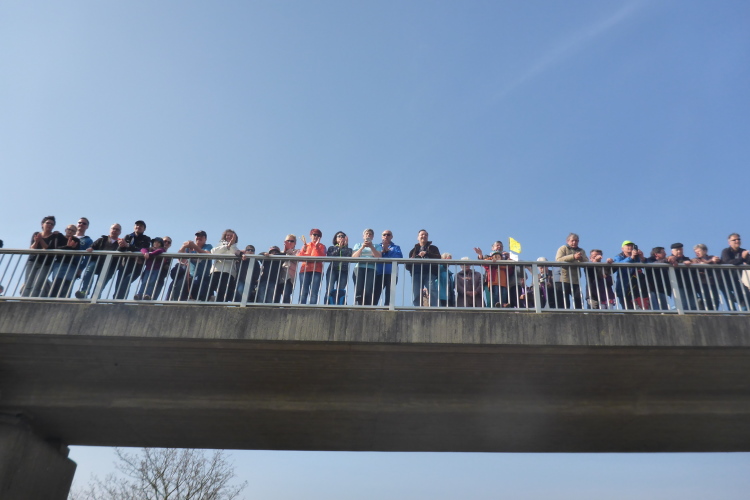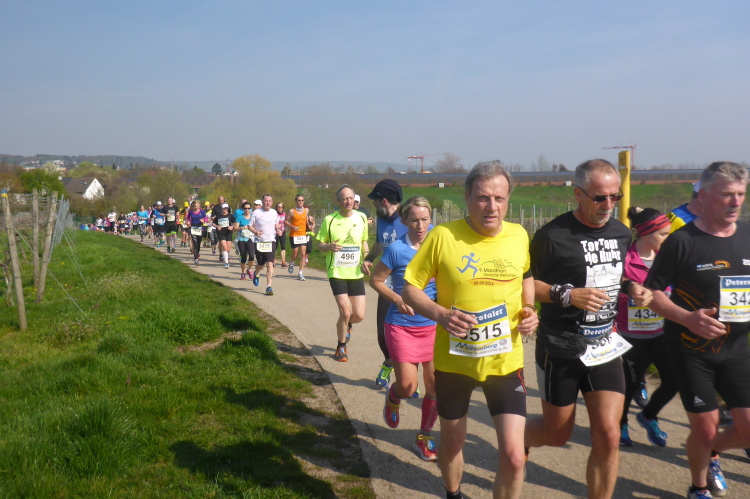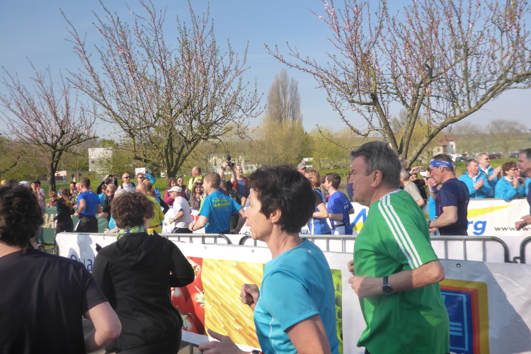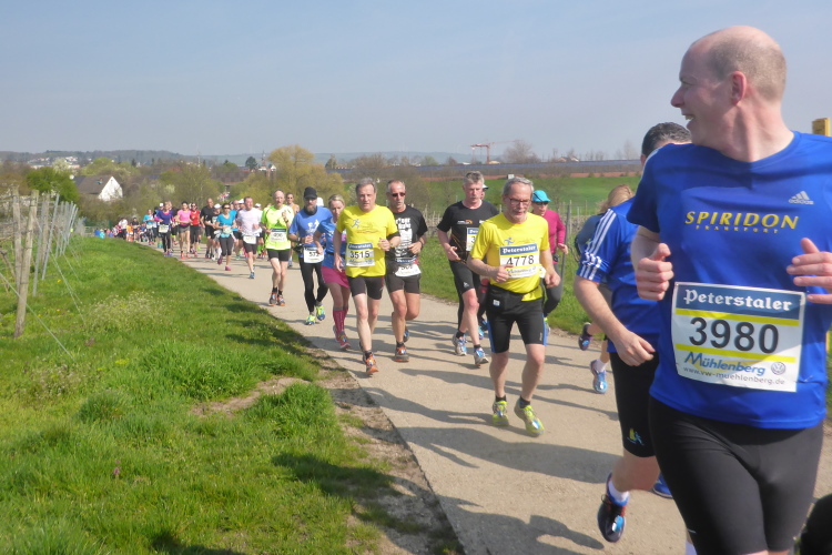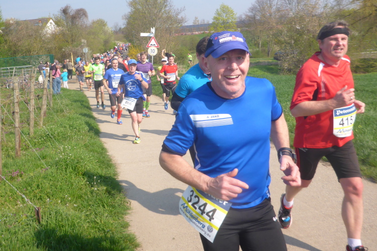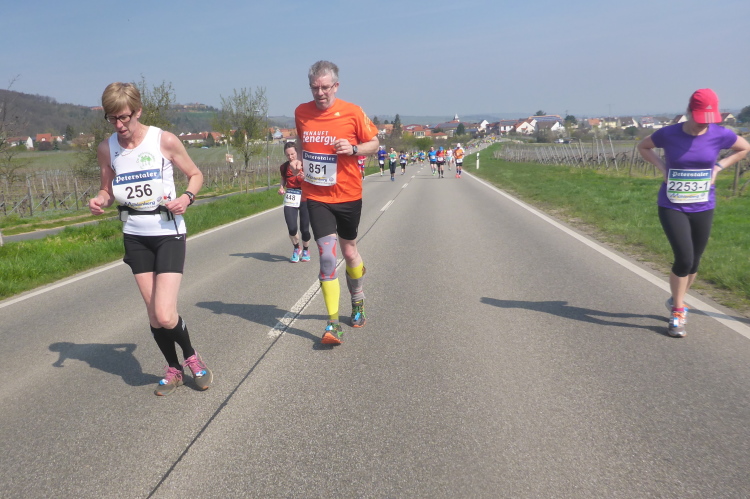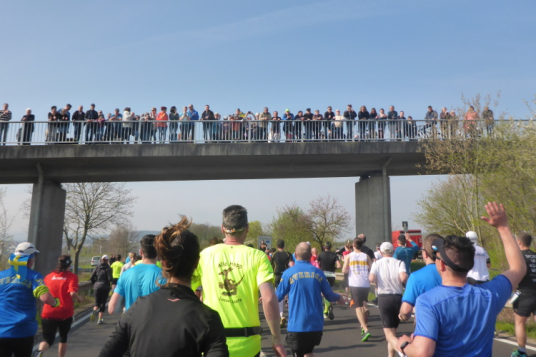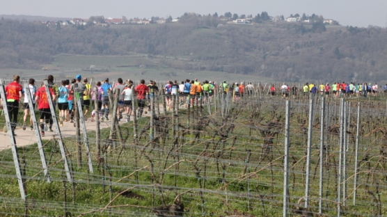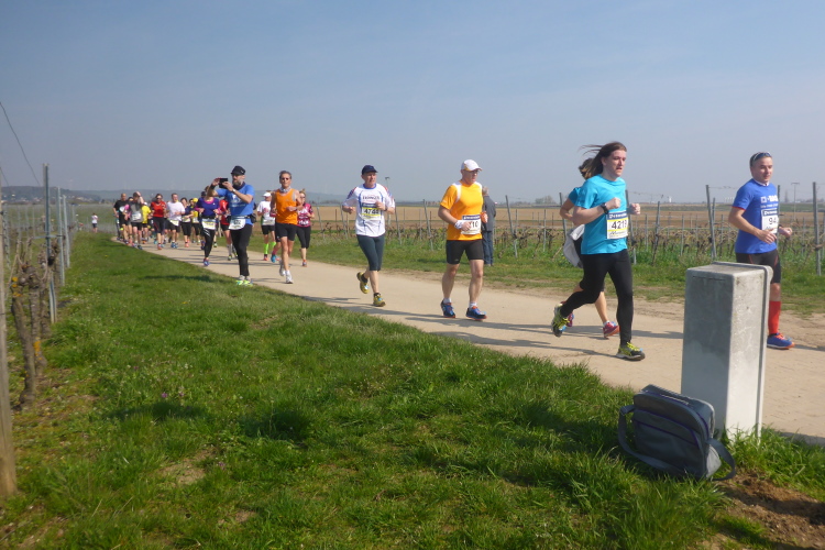 Wir verlassen nun die Deutsche Weinstraße, kommen unter der Autobahn hindurch und streifen Sausenheim, wo die Bewohner zum Klatschen aus ihren Häusern gekommen sind. Plötzlich finden wir uns in den Weinbergen wieder, es geht bergauf. Eine endlose bunte Läuferschlange schlängelt sich zwischen den noch kahlen Reben hindurch. Auf der Höhe hat man eine grandiose Rundumsicht. Leider ist es noch zu diesig um Details zu erkennen. Ganz weit vorne geht es wohl rechts und dann wieder endlos geradeaus.