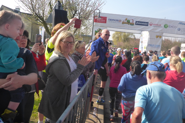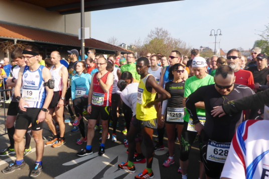 Obwohl der Start nur wenige Meter entfernt ist, gestaltet sich der Weg dorthin schwierig. Der abgesperrte Startblock ist überfüllt, die Läufer stauen sich vor dem Tor. Weil ich das bereits vor 4 Jahren erlebt habe, bleibe ich ruhig. Es ist ja Nettozeitmessung und daher egal, wann ich starte. Die Läufer um mich herum sehen das ähnlich. Wir hören den Sprecher, der die Läufer in den Sprachen der anwesenden Sportler begrüßt, anschließend wird die Prominenz vorgestellt. Pünktlich um 10 Uhr ertönt der Startschuss. Wir warten, aber nichts passiert. Auf einmal geht es voran. Ich sehe das Gitter zum Startblock. Schnell bin ich drin, und kann sofort los laufen. Vorbei an applaudierenden Zuschauern geht es durch das große Starttor. Auch dahinter ist das Spalier der Zuschauer dicht und wir werden frenetisch angefeuert.