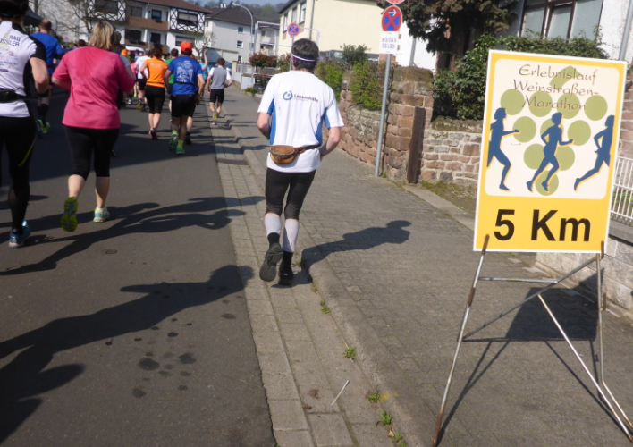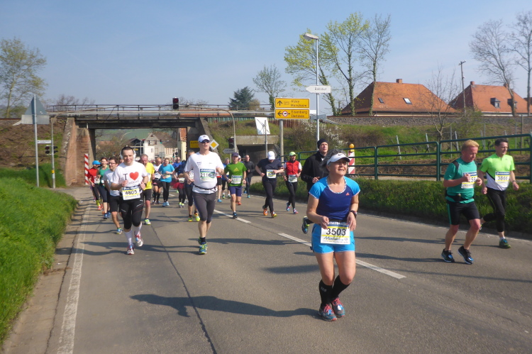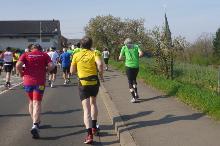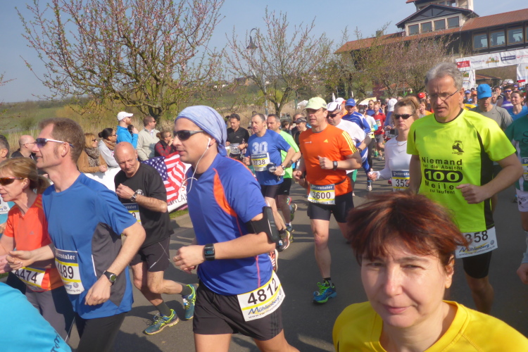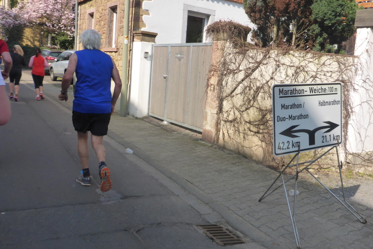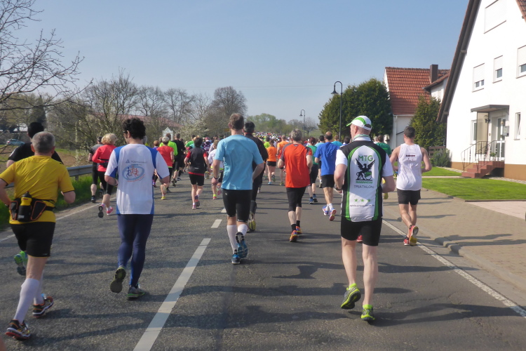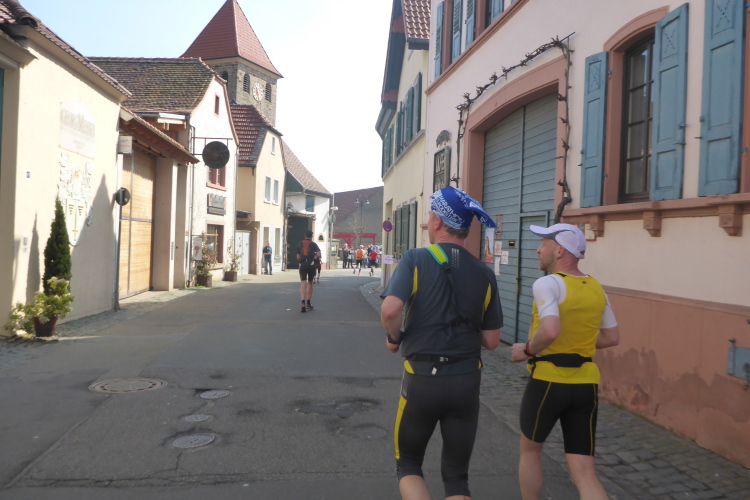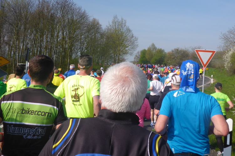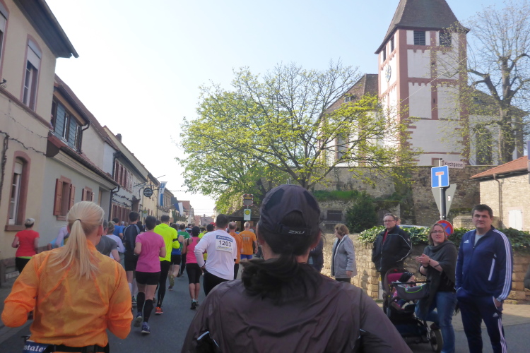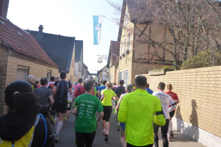 Wir laufen auf der Hauptstraße von Bockenheim. Überall sind die Tore offen und Anwohner ergötzen sich an den Massen von Läufern. Wir wiederum freuen uns über den schön geschmückten alten Ortskern. Wie ein Wunder taucht Norbert neben mir auf. Trotz der Hektik hatte er mich wohl die ganze Zeit im Blick. Am Ortsausgang ist die erste Aufregung vorüber und es wird Zeit, ein geeignetes Tempo zu finden. Bisher bin ich zu schnell unterwegs. Ich wechsle an den Fahrbahnrand und lasse das Feld vorbeiziehen. Da mit zu rennen, wäre glatter Selbstmord. Norbert hingegen verabschiedet sich und rauscht davon.