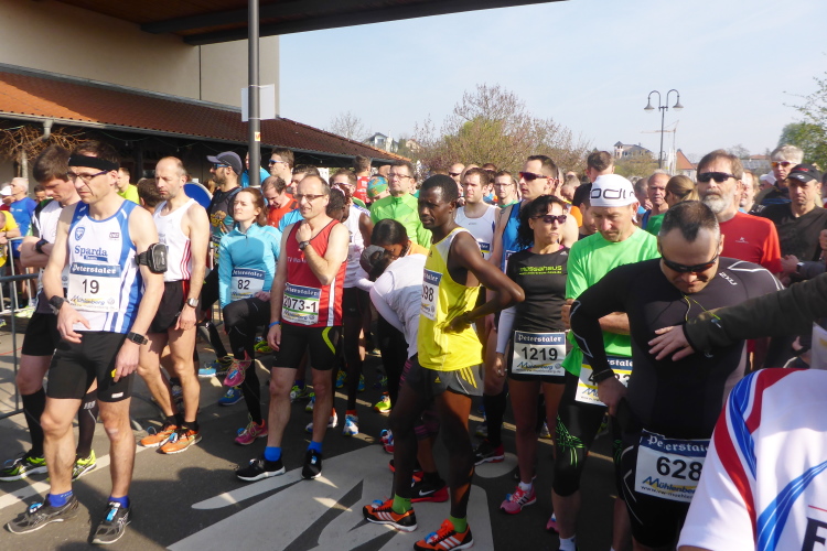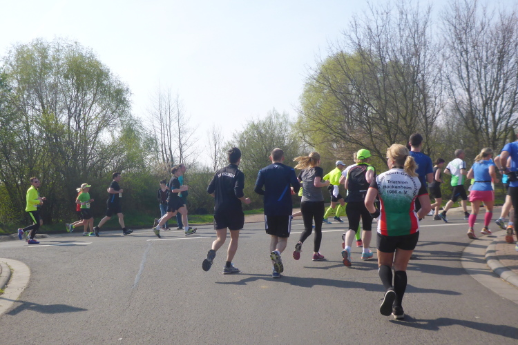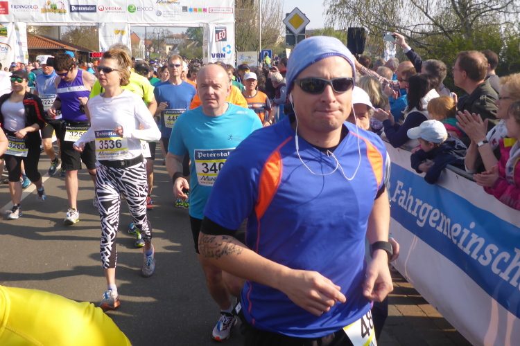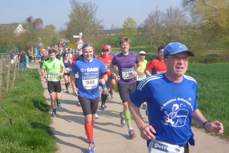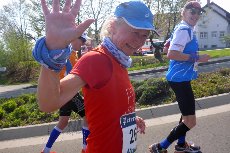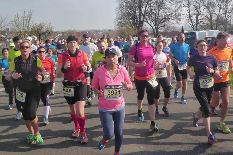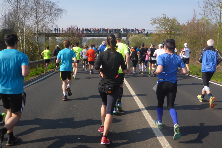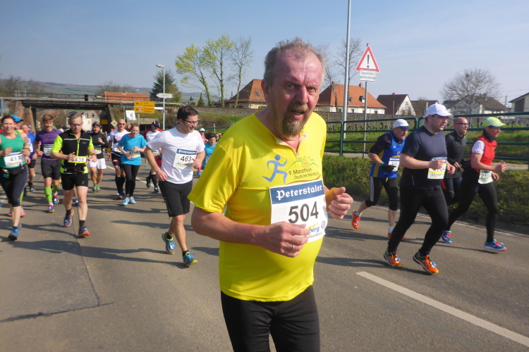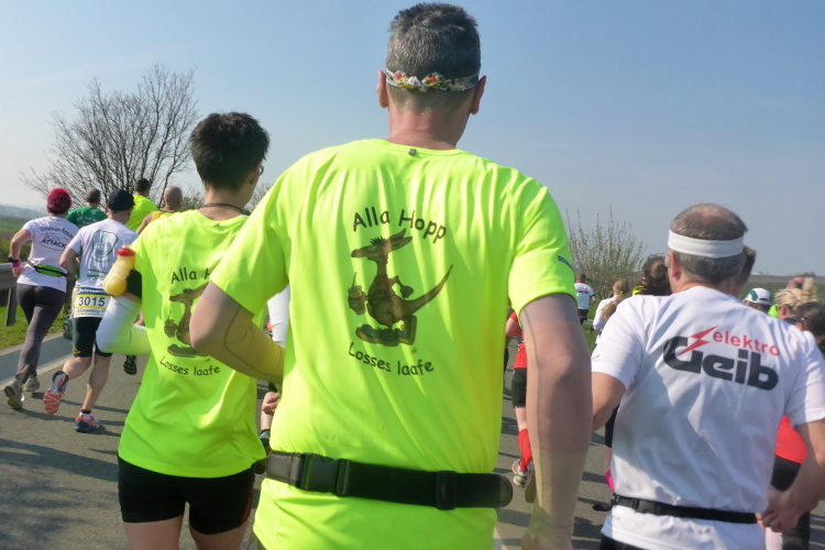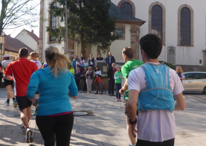 Wir laufen auf der Hauptstraße von Bockenheim. Überall sind die Tore offen und Anwohner ergötzen sich an den Massen von Läufern. Wir wiederum freuen uns über den schön geschmückten alten Ortskern. Wie ein Wunder taucht Norbert neben mir auf. Trotz der Hektik hatte er mich wohl die ganze Zeit im Blick. Am Ortsausgang ist die erste Aufregung vorüber und es wird Zeit, ein geeignetes Tempo zu finden. Bisher bin ich zu schnell unterwegs. Ich wechsle an den Fahrbahnrand und lasse das Feld vorbeiziehen. Da mit zu rennen, wäre glatter Selbstmord. Norbert hingegen verabschiedet sich und rauscht davon.