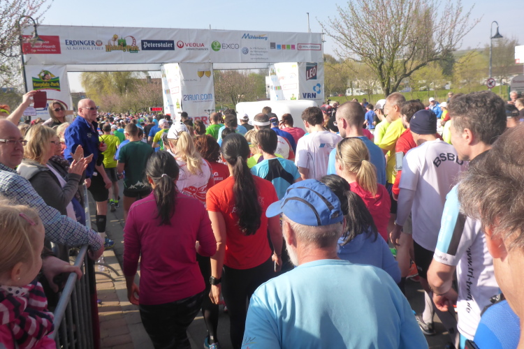 Wenn man aus Stuttgart kommend die Autobahn verlässt, fährt man auf der B271, auf der die Weinstraße z.T entlang führt. Bockenheim ist noch nicht in Sicht, da passieren wir bereits das Marathonschild für km 40. Hier ist also das Ende der Laufstrecke. Selbst mit dem Auto erscheint die Distanz auf der geraden Straße ziemlich lang; ein kleiner Vorgeschmack auf das Kommende. Im Ort selbst werden wir weg von der Hauptstraße, durch schmale Gässchen, zu einem großen Firmenparkplatz am Ortsrand geleitet. Der Shuttlebus für die umliegenden Orte hat Probleme, zwischen den Parkplatzsuchenden durchzukommen. Wir sind froh, als wir mit dem Auto endlich einen guten Standplatz gefunden haben und machen uns gemeinsam mit den anderen Läufern auf den Weg zum Startgelände.