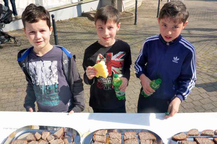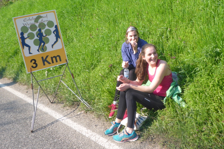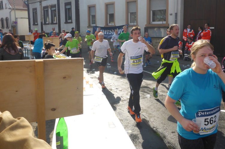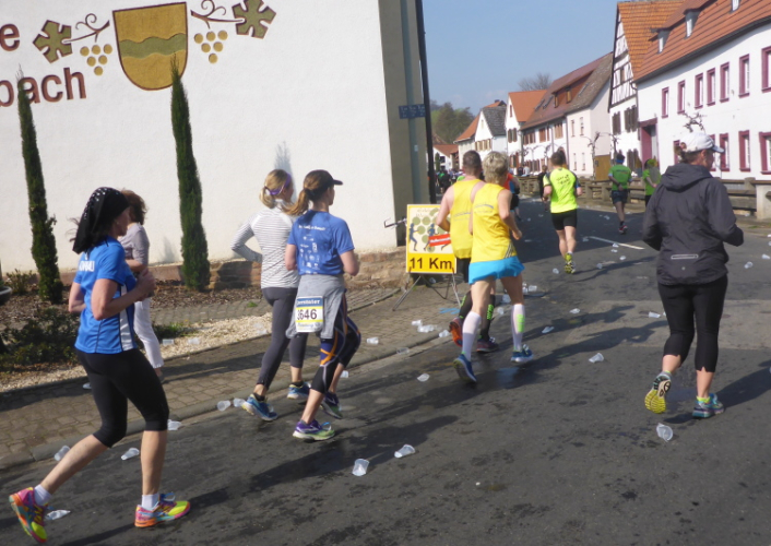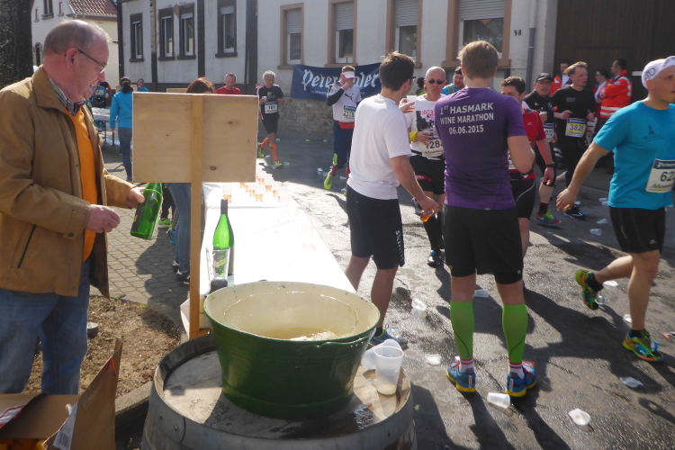 Nach einer steilen Bergabpassage müssen wir uns konzentrieren, denn in Kleinkarlbach trennen sich Marathon und Halbmarathon. Die Marathonis müssen zunächst rechts. Nach einem knappen Kilometer kommen die Halbmarathonis wieder, dann müssen die Marathonis nach links. Dazwischen liegt noch die Verpflegungsstelle. Es gibt Leberwurstbrot. Für mich ist es dafür noch zu früh, solche deftige Speisen vertrage ich erst in der zweiten Hälfte eines Marathons - schade. Am Ende des Verpflegungsstandes wird ein „Rieslingschwamm“ angeboten. Man tränkt, allen Ernstes, einen Schwamm in einer Schüssel mit Wein und kann diesen dann aussaugen. Das ist nichts für mich. Ich bediene mich mit einem Becher. Echter Kleinkarlbacher Riesling - da kann ich nicht nein sagen.