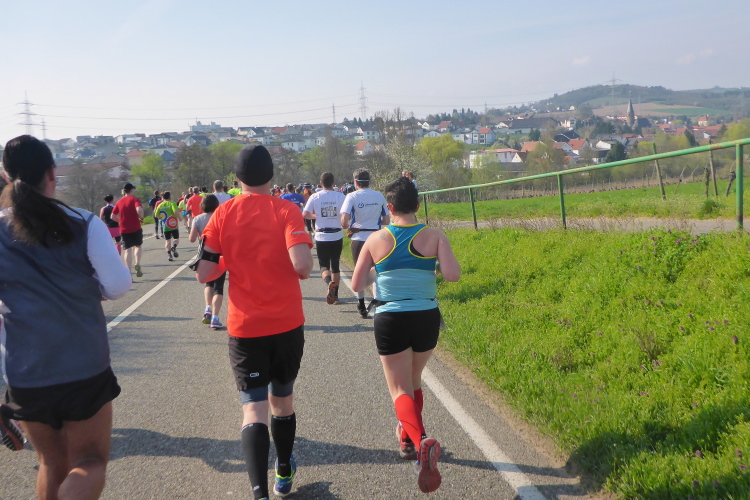 Bei km 2 geht es rechts auf die K516 und steil bergab. Hier dürfen wir bei km 39 wieder hoch. Ich genieße die schöne Aussicht auf Asselheim, das zu unseren Füßen liegt. Am Kreisverkehr laufen wir in den Ort, hier geht es wieder bergauf. Eigentlich hatte ich mir vorgenommen, die Steigungen zu gehen. Aber hier geht niemand. Also laufe ich ebenfalls in lockerem Schritt bis zur ersten Wasserstelle. Ein paar Schluck tun gut. Es verspricht ein wunderbarer Frühlingstag zu werden.