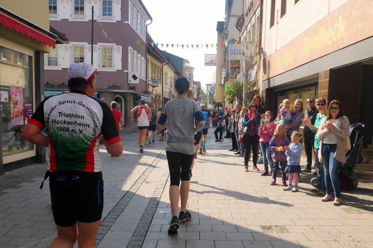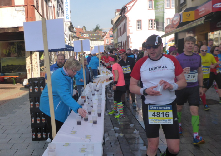 Die restliche Steigung gehe ich nun doch. Wir erreichen Grünstadt bei km 5. Hier ist die Fußgängerzone reich geschmückt. Außerdem stehen viele Zuschauer Spalier. Die erste Verpflegungsstelle bietet gesüßten heißen Tee; da greife ich gerne zu.