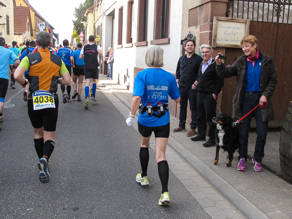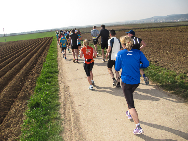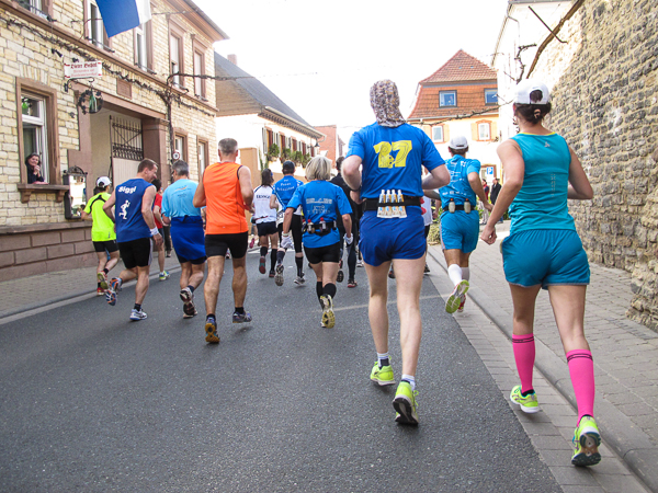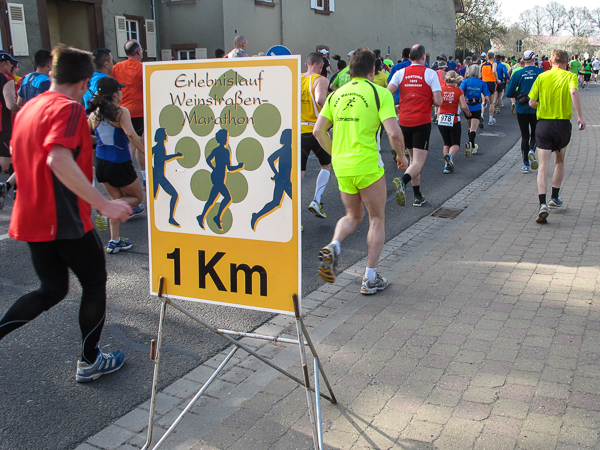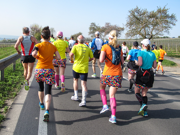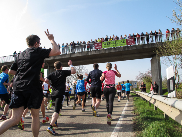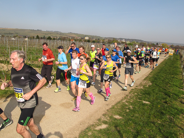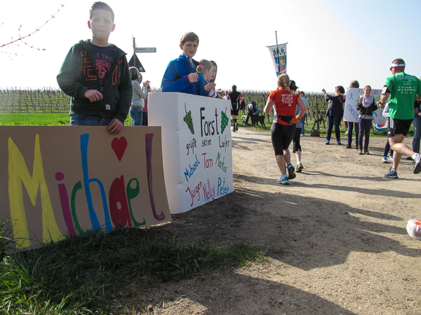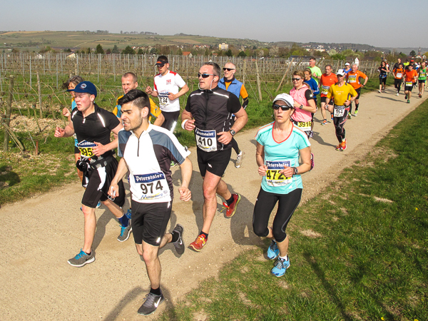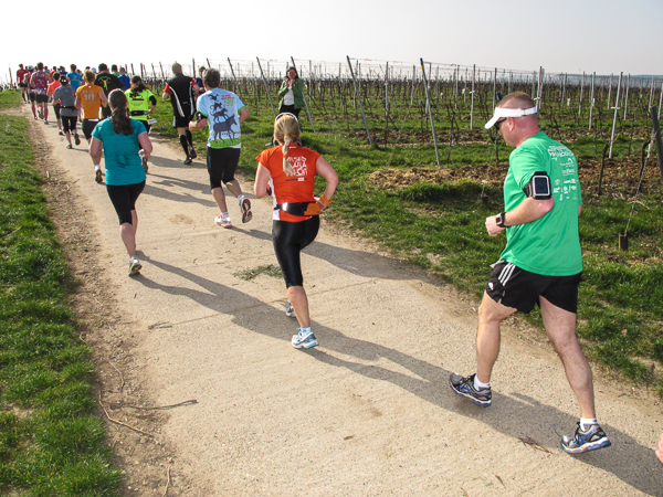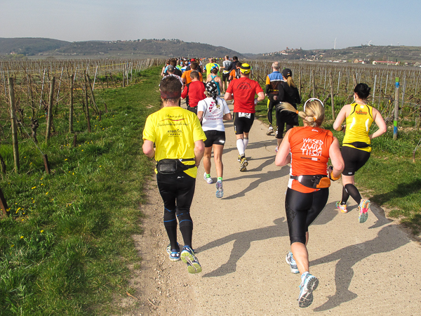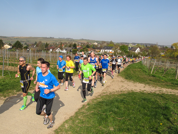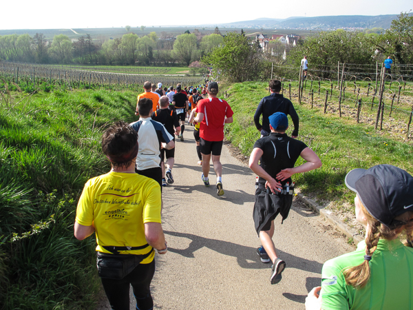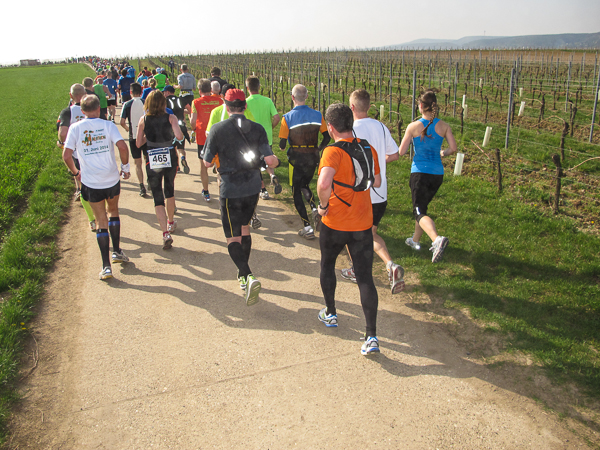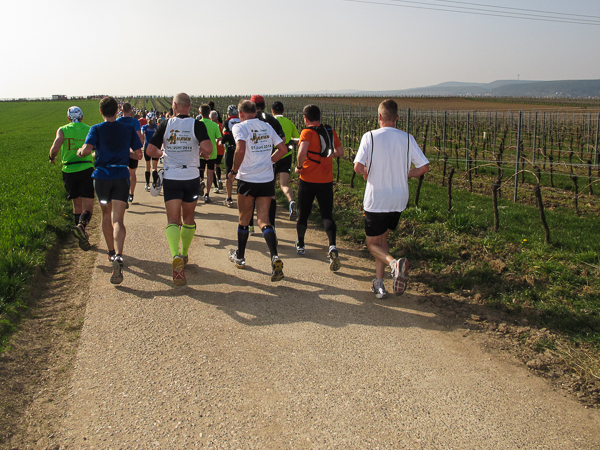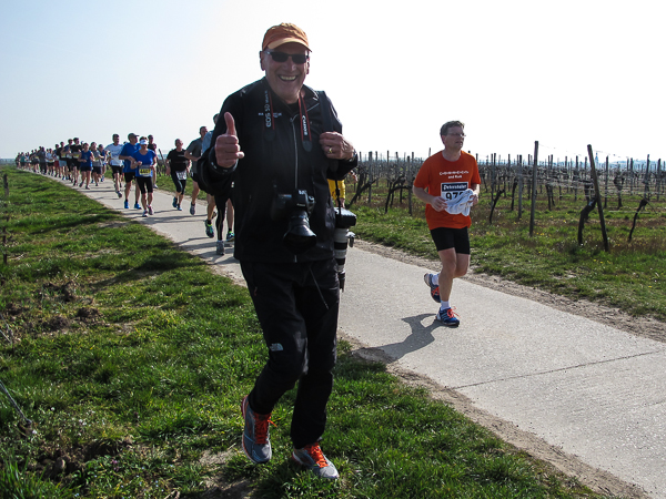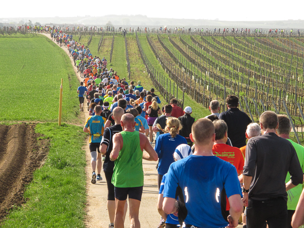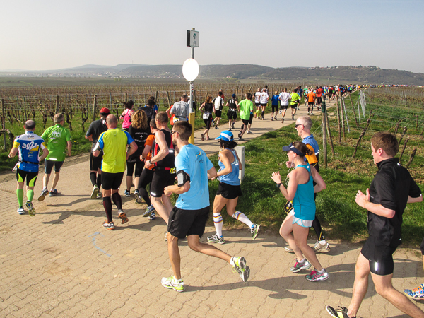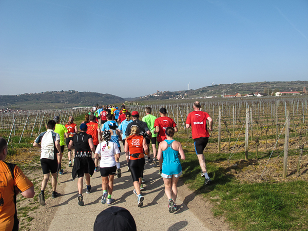 Wo sonst traubenbehangene Weinberge sind, laufen farbige Läuferpunkte entlang der knorrigen, noch splitternackten Rebknorze, die zu tausenden schnurgerade in Reih‘ und Glied stehen. Zwischen den Reihen sprießt frisches, junges Gras. Die vielen Feldwege sind kurvenfrei und meist asphaltiert, Bäume und Hecken sind dagegen Mangelware. „Isch kumm aus dä Palz“, tönt ein kommunikationsfreudiger Läufer und gesellt sich zu mir. Seine Offenheit ist entwaffnend. Die Pfälzer Frohnatur fühlt sich sichtlich wohl. „Un wi ald bischd´n du?“, und deutet gleichzeitig auf ein Schild mit einer kleinbeerigen, schwarzen Traube auf gelben Grund.